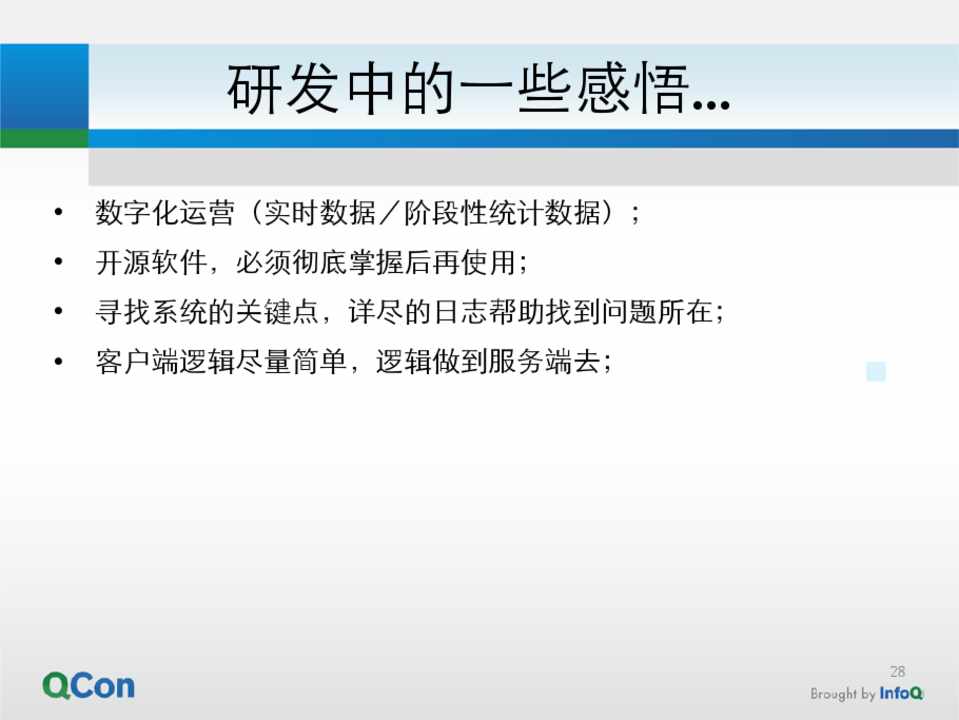 • 数字化运营(实时数据/阶段性统计数据); • 开源软件,必须彻底掌握后再使⽤用; • 寻找系统的关键点,详尽的⽇日志帮助找到问题所在; • 客户端逻辑尽量简单,逻辑做到服务端去;