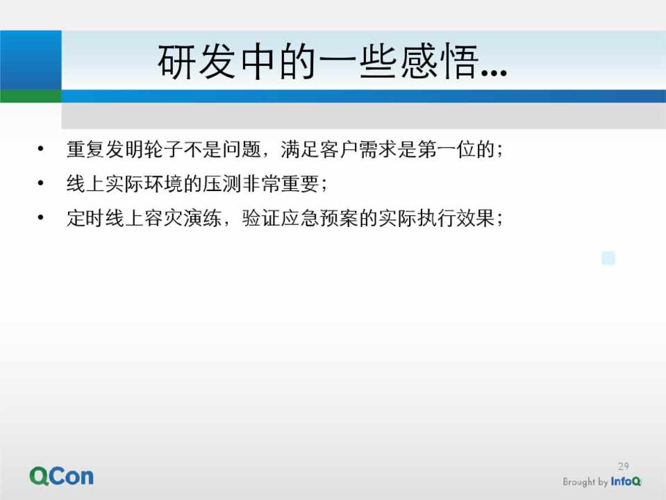 • 重复发明轮⼦子不是问题,满⾜足客户需求是第⼀一位的; • 线上实际环境的压测⾮非常重要; • 定时线上容灾演练,验证应急预案的实际执⾏行效果;