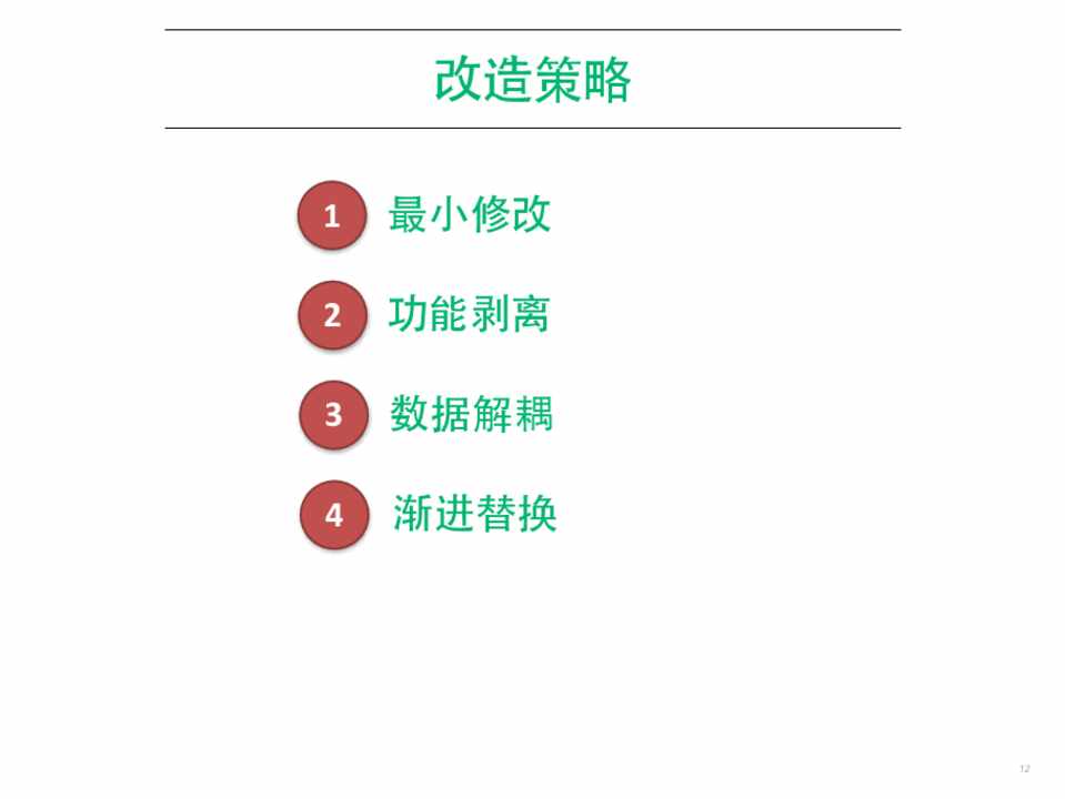 1 最⼩小修改 2 功能剥离 3 数据解耦 4 渐进替换