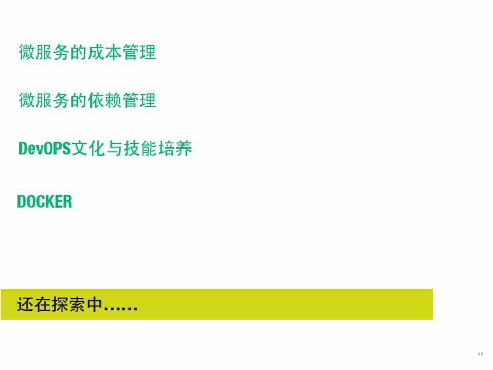 微服务的成本管理 微服务的依赖管理 DevOPS⽂文化与技能培养 DOCKER