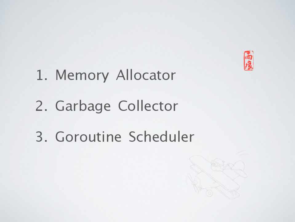 1. Memory Allocator 2. Garbage Collector 3. Goroutine Scheduler