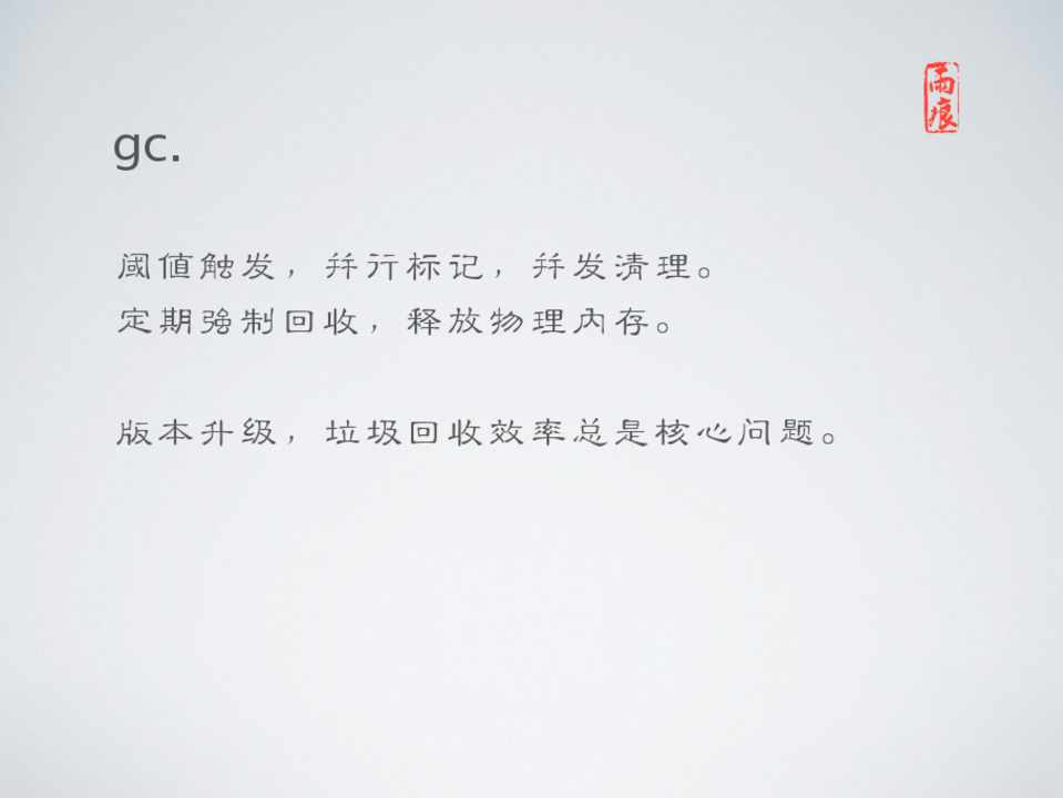 阈值触发,并行标记,并发清理。 定期强制回收,释放物理内存。