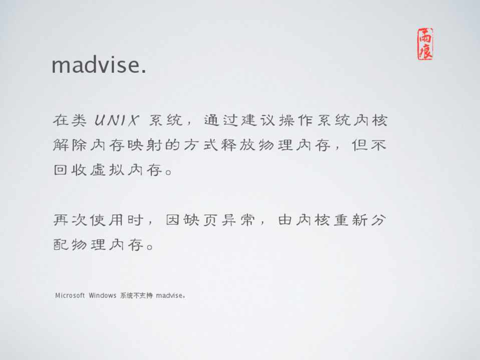在类 UNIX 系统,通过建议操作系统内核 解除内存映射的方式释放物理内存,但不 回收虚拟内存。