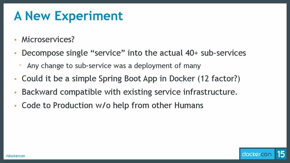 • Could it be a simple Spring Boot App in Docker (12 factor?) • Backward compatible with existing service infrastructure. • Code to Production w/o help from other Humans