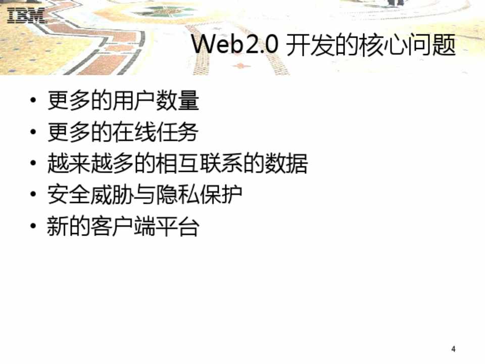 • 更多的用户数量 • 更多的在线任务 • 越来越多的相互联系的数据 • 安全威胁与隐私保护 • 新的客户端平台