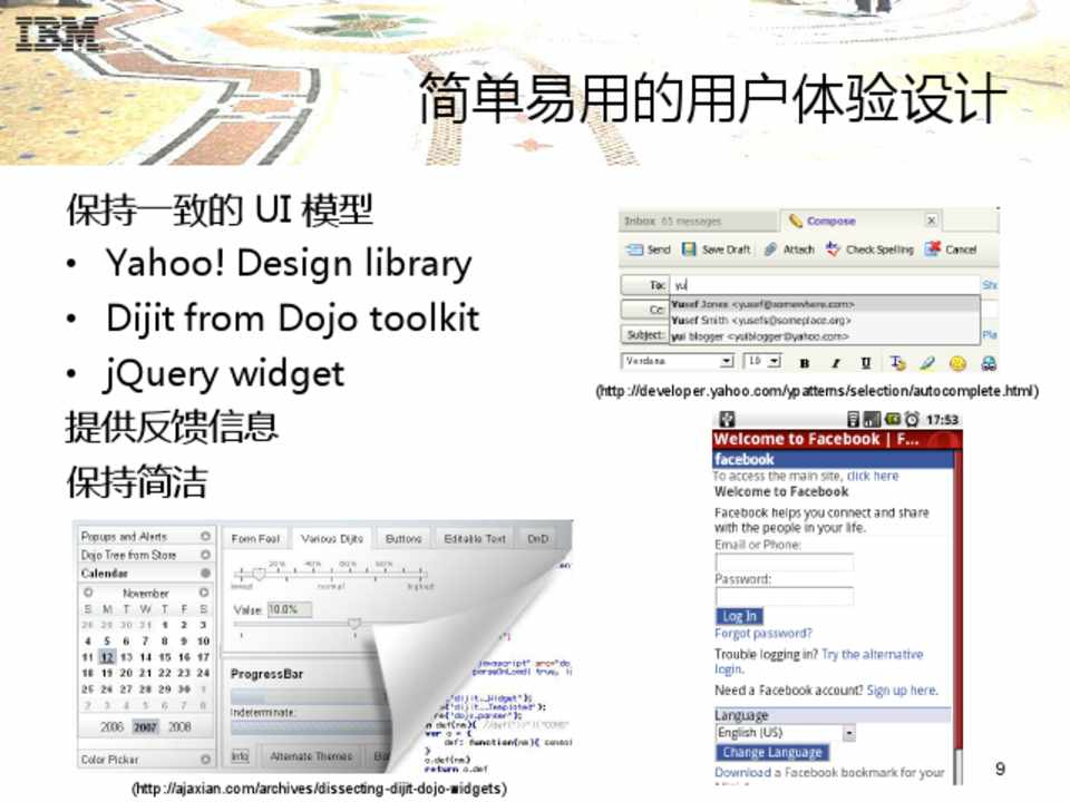 保持一致的 UI 模型 • Yahoo! Design library • Dijit from Dojo toolkit • jQuery widget 提供反馈信息 保持简洁