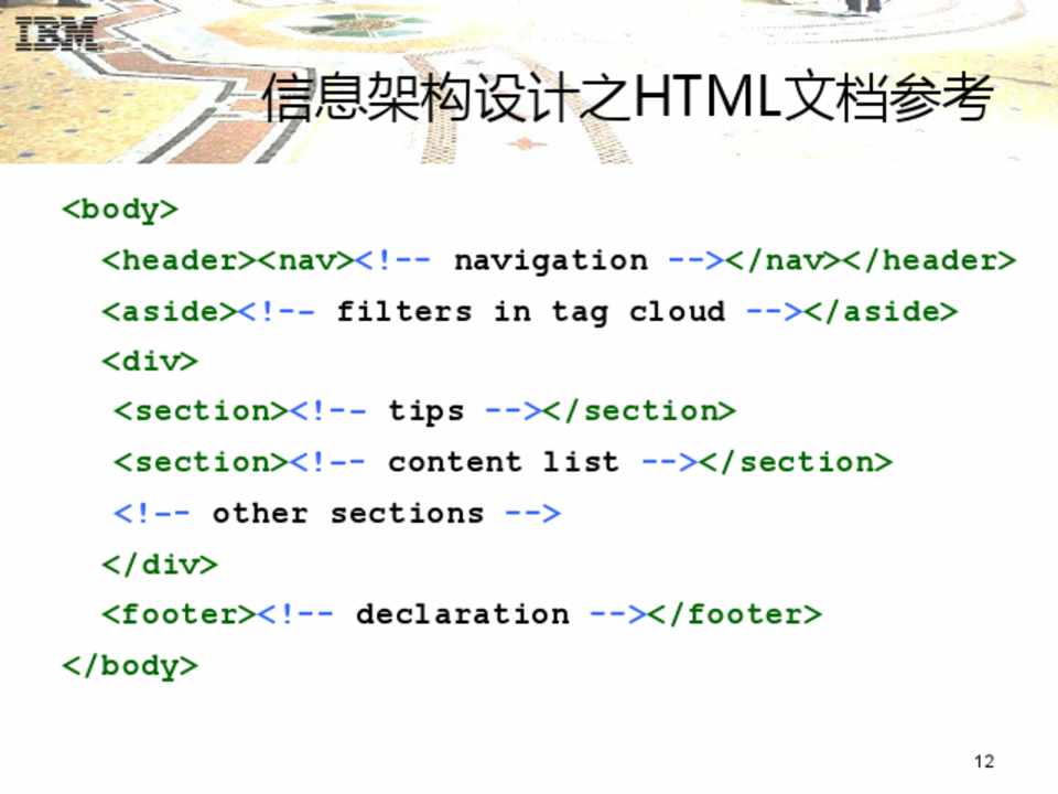 <body> <header><nav><!-- navigation --></nav></header> <aside><!-– filters in tag cloud --></aside> <div> <section><!-– tips --></section> <section><!–- content list --></section> <!–- other sections --> </div> <footer><!-- declaration --></footer>