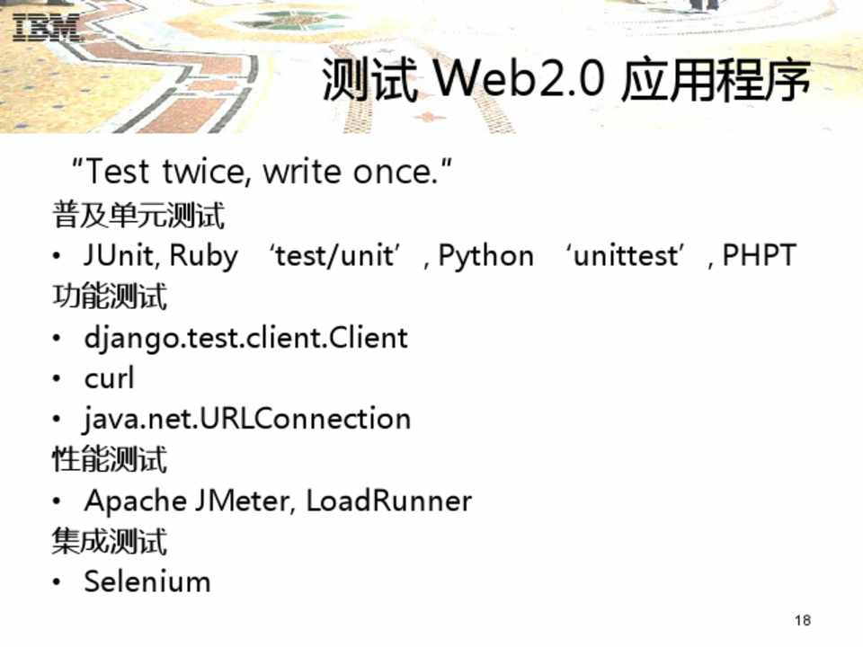普及单元测试 • JUnit, Ruby ‘test/unit’, Python ‘unittest’, PHPT 功能测试 • django.test.client.Client • curl • java.net.URLConnection 性能测试 • Apache JMeter, LoadRunner 集成测试 • Selenium
