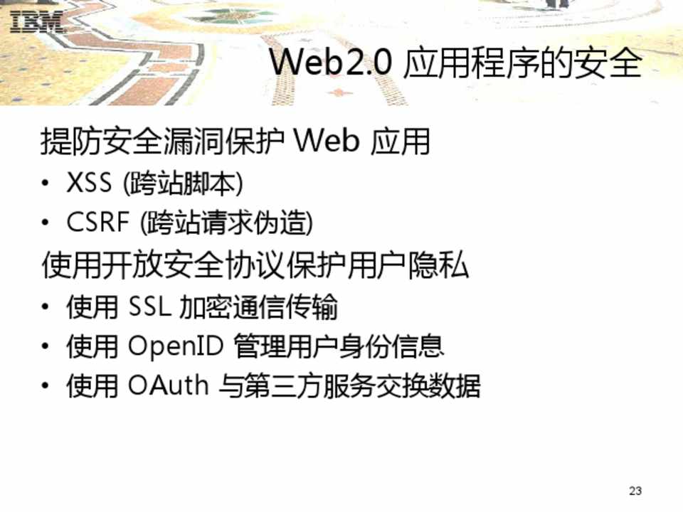 • 使用 SSL 加密通信传输 • 使用 OpenID 管理用户身份信息 • 使用 OAuth 与第三方服务交换数据