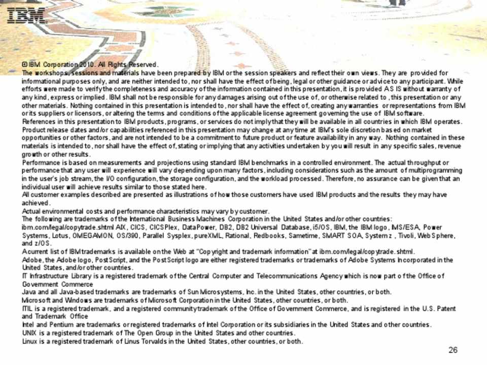 © IBM Corporation 2010. All Rights Reserved. The workshops, sessions and materials have been prepared by IBM or the session speakers and ref lect their own views. They are provided f or inf ormational purposes only, and are neither intended to, nor shall have the ef f ect of being, legal or other guidance or advi ce to any participant. While ef f orts were made to verif y the completeness and accuracy of the inf ormation contained in this presentation, it is provided A S IS without warranty of any kind, express or implied. IBM shall not be responsible f or any damages arising out of the use of , or otherwise related to , this presentation or any other materials. Nothing contained in this presentation is intended to, nor shall have the ef f ect of, creating any warranties or representations f rom IBM or its suppliers or licensors, or altering the terms and conditions of the applicable license agreement governing the use of IBM sof tware. Ref erences in this presentation to IBM products, programs, or services do not imply that they will be available in all countr ies in which IBM operates. Product release dates and/or capabilities ref erenced in this presentation may change at any time at IBM’s sole discretion bas ed on market opportunities or other f actors, and are not intended to be a commitment to f uture product or f eature availability in any way. Nothing contained in these materials is intended to, nor shall have the ef f ect of, stating or implying that any activities undertaken by you will result in any specif ic sales, revenue growth or other results. Perf ormance is based on measurements and projections using standard IBM benchmarks in a controlled environment. The actual th roughput or perf ormance that any user will experience will vary depending upon many f actors, including considerations such as the amount of multiprogramming in the user's job stream, the I/O conf iguration, the storage conf iguration, and the workload processed. Theref ore, no assurance can be given that an individual user will achieve results similar to those stated here. All customer examples described are presented as illustrations of how those customers have used IBM products and the results they may have achieved. Actual environmental costs and perf ormance characteristics may vary by customer. The f ollowing are trademarks of the International Business Machines Corporation in the United States and/or other countries: ibm.com/legal/copytrade.shtml AIX, CICS, CICSPlex, DataPower, DB2, DB2 Universal Database, i5/OS, IBM, the IBM logo, IMS/ESA, Power Systems, Lotus, OMEGAMON, OS/390, Parallel Sysplex, pureXML, Rational, Redbooks, Sametime, SMART SOA, System z , Tivoli, WebS phere, and z/OS. A current list of IBM trademarks is available on the Web at “Copyright and trademark inf ormation” at ibm.com/legal/copytrade. shtml. Adobe, the Adobe logo, PostScript, and the PostScript logo are either registered trademarks or trademarks of Adobe Systems In corporated in the United States, and/or other countries. IT Inf rastructure Library is a registered trademark of the Central Computer and Telecommunications Agency which is now part o f the Of f ice of Government Commerce Java and all Java-based trademarks are trademarks of Sun Microsystems, Inc. in the United States, other countries, or both. Microsof t and Windows are trademarks of Microsoft Corporation in the United States, other countries, or both. ITIL is a registered trademark, and a registered community trademark of the Of f ice of Government Commerce, and is registered in the U.S. Patent and Trademark Of f ice Intel and Pentium are trademarks or registered trademarks of Intel Corporation or its subsidiaries in the United States and o ther countries. UNIX is a registered trademark of The Open Group in the United States and other countries. Linux is a registered trademark of Linus Torvalds in the United States, other countries, or both.