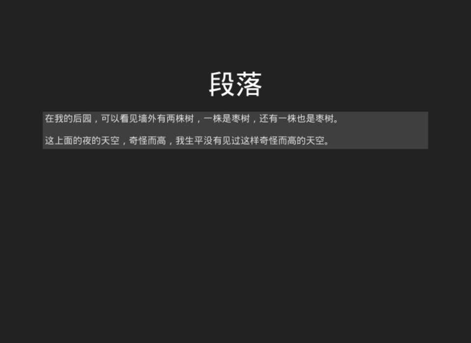 在我的后园,可以看见墙外有两株树,一株是枣树,还有一株也是枣树。 这上面的夜的天空,奇怪而高,我生平没有见过这样奇怪而高的天空。 <p>在我的后园,可以看见墙外有两株树,一株是枣树,还有一株也是枣树。</p> <p>这上面的夜的天空,奇怪而高,我生平没有见过这样奇怪而高的天空。</p>