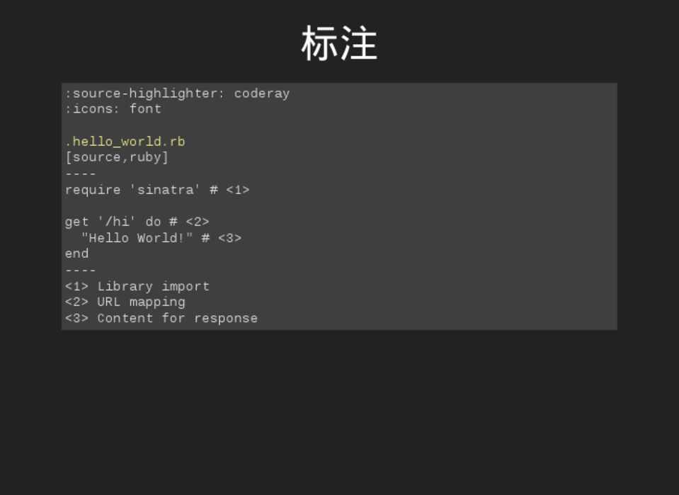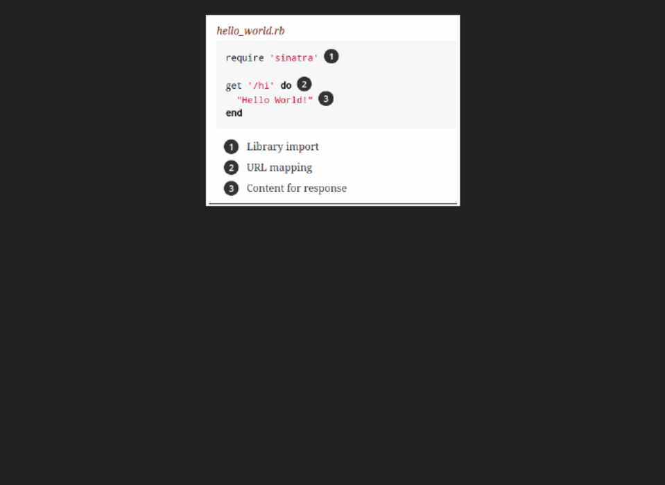 get'/hi'do#<2> "HelloWorld!"#<3> end <1>Libraryimport <2>URLmapping <3>Contentforresponse