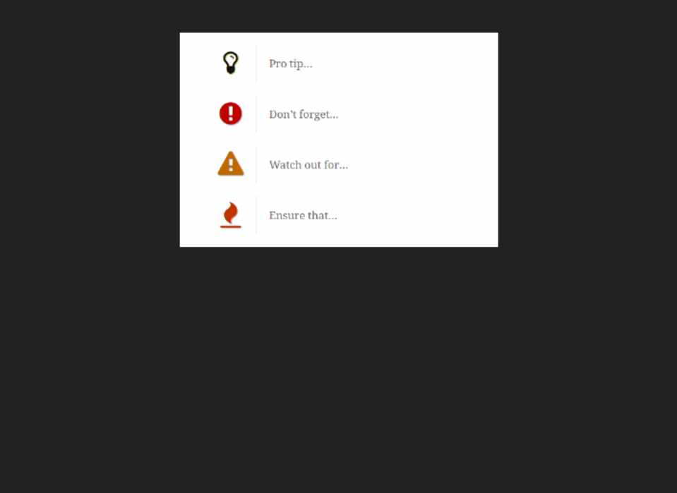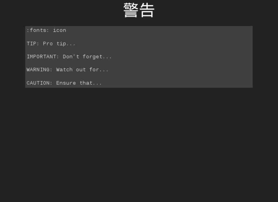 :fonts:icon TIP:Protip... IMPORTANT:Don'tforget... WARNING:Watchoutfor... CAUTION:Ensurethat...