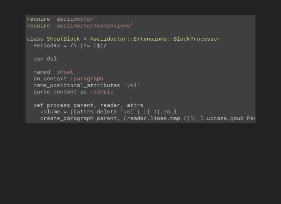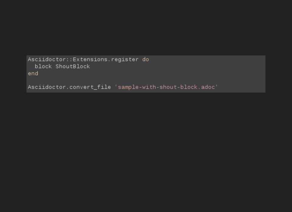 Asciidoctor::Extensions.registerdo blockShoutBlock end
