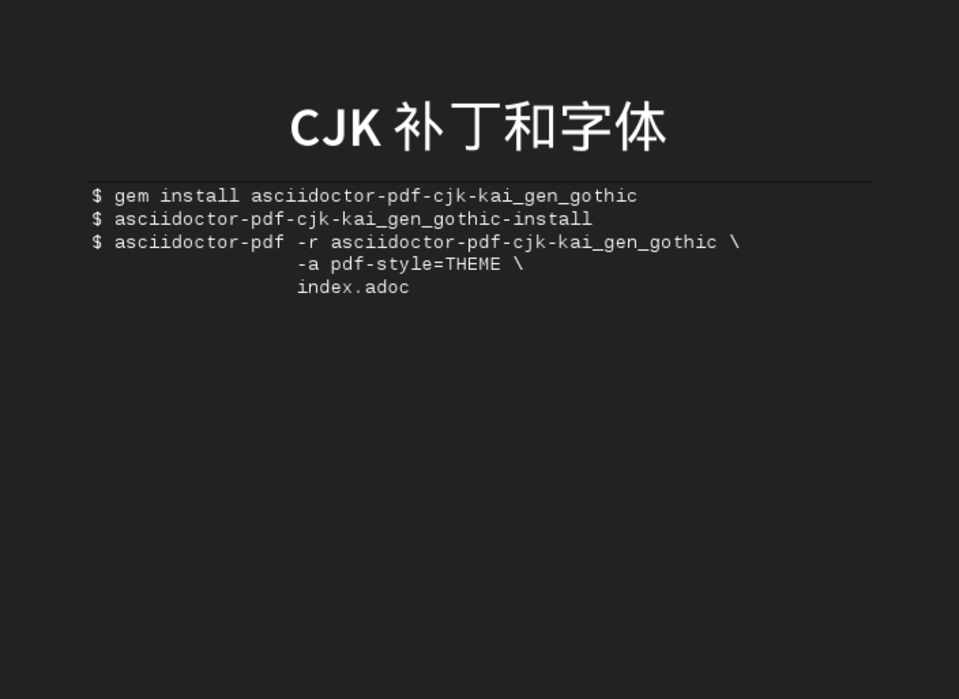 $geminstallasciidoctorpdfcjkkai_gen_gothic $asciidoctorpdfcjkkai_gen_gothicinstall $asciidoctorpdfrasciidoctorpdfcjkkai_gen_gothic\ apdfstyle=THEME\ index.adoc