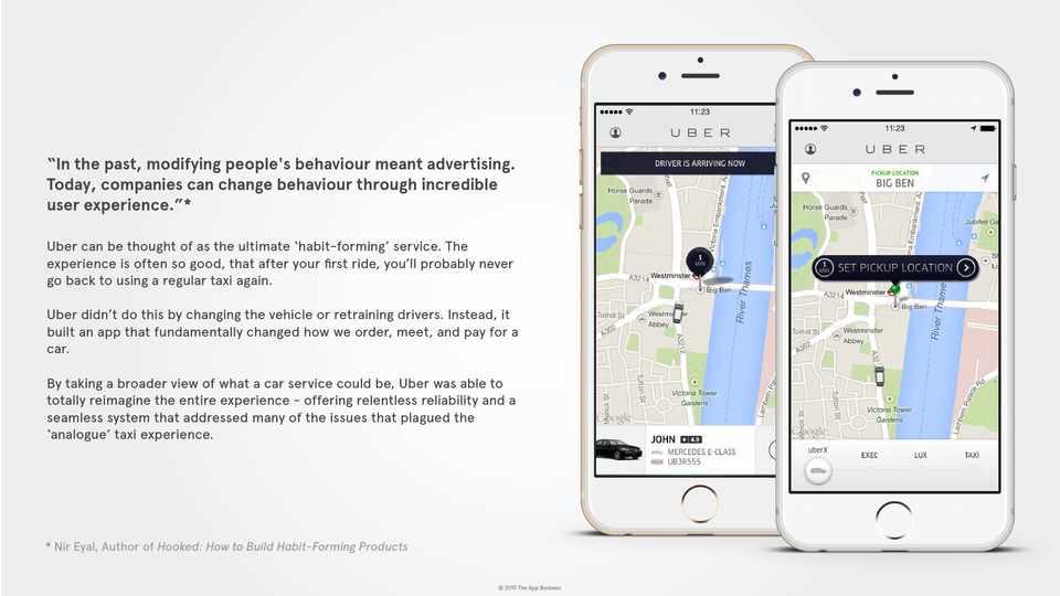 Uber can be thought of as the ultimate ‘habit-forming’ service. The experience is often so good, that after your first ride, you’ll probably never go back to using a regular taxi again.