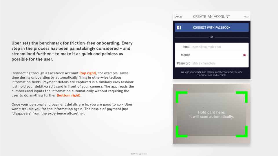 Connecting through a Facebook account (top right), for example, saves time during onboarding by automatically filling in otherwise tedious information fields. Payment details are captured in a similarly easy fashion: just hold your debit/credit card in front of your camera. The app reads the numbers and inputs the information automatically without requiring the user to do anything further (bottom right). Once your personal and payment details are in, you are good to go - Uber won’t trouble you for the information again. The hassle of payment just ‘disappears’ from the experience altogether.