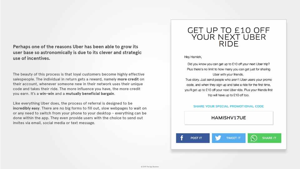 The beauty of this process is that loyal customers become highly effective salespeople. The individual in return gets a reward, namely more credit on their account, whenever someone new in their network uses their unique code and takes their ride. The more influence you have, the more credit you earn. It’s a win-win and a mutually beneficial bargain. Like everything Uber does, the process of referral is designed to be incredibly easy. There are no big forms to fill out, slow webpages to wait on or any need to switch from your phone to your desktop - everything can be done within the app. They even provide users with the choice to send out invites via email, social media or text message.