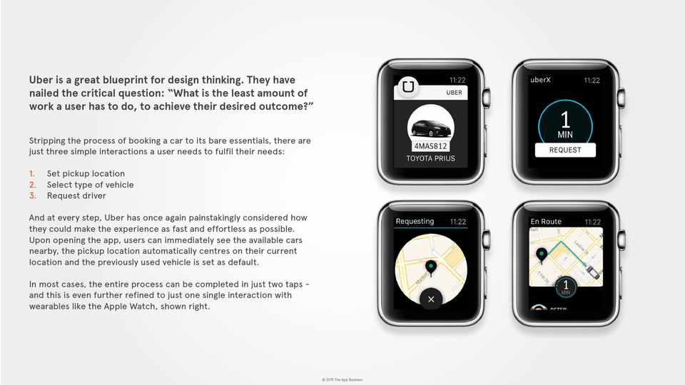Uber is a great blueprint for design thinking. They have nailed the critical question: “What is the least amount of work a user has to do, to achieve their desired outcome?”
