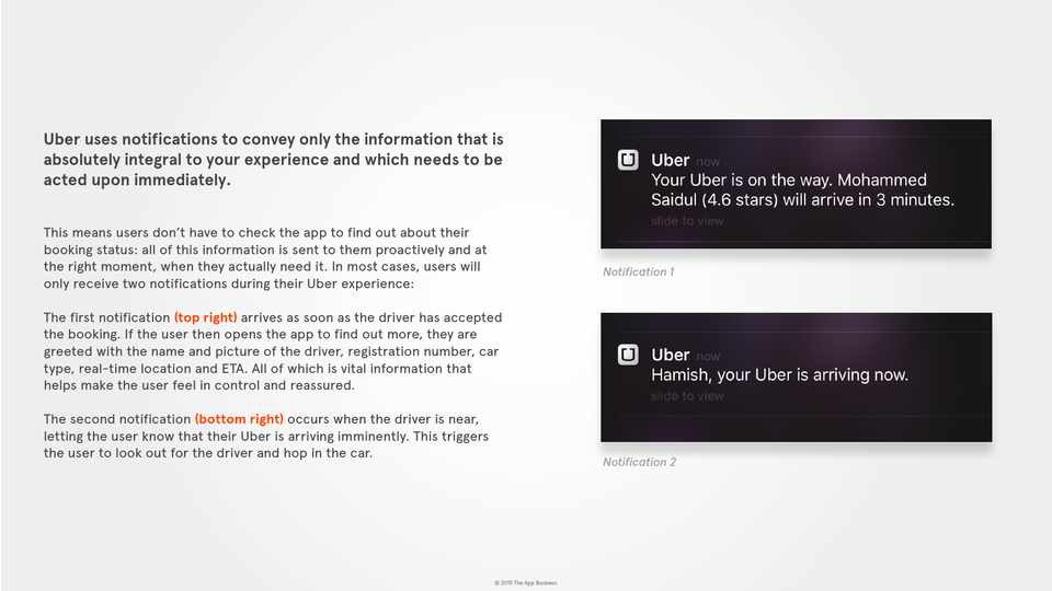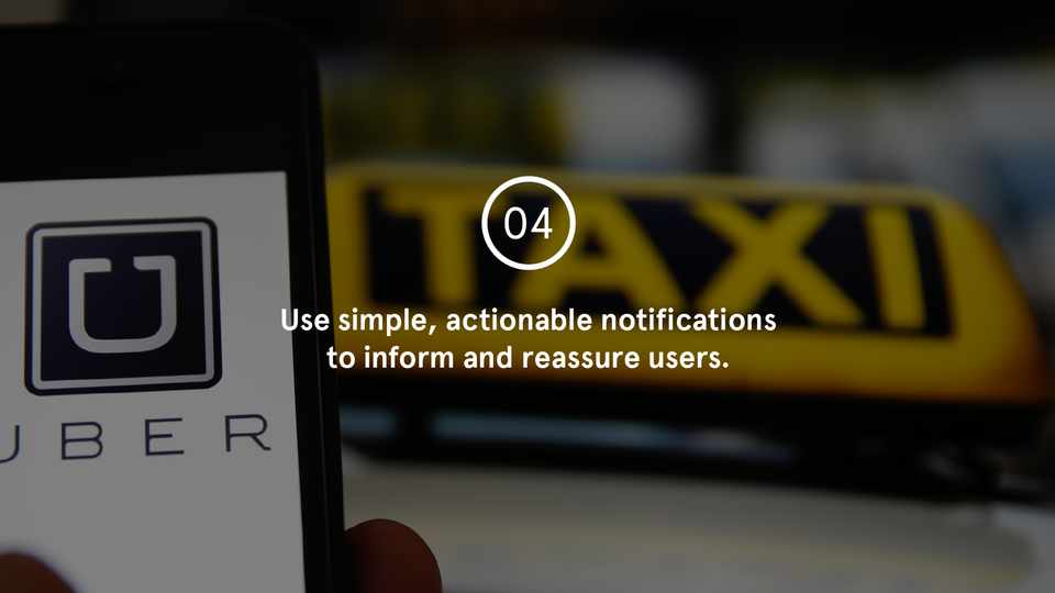 Uber uses notifications to convey only the information that is absolutely integral to your experience and which needs to be acted upon immediately.
