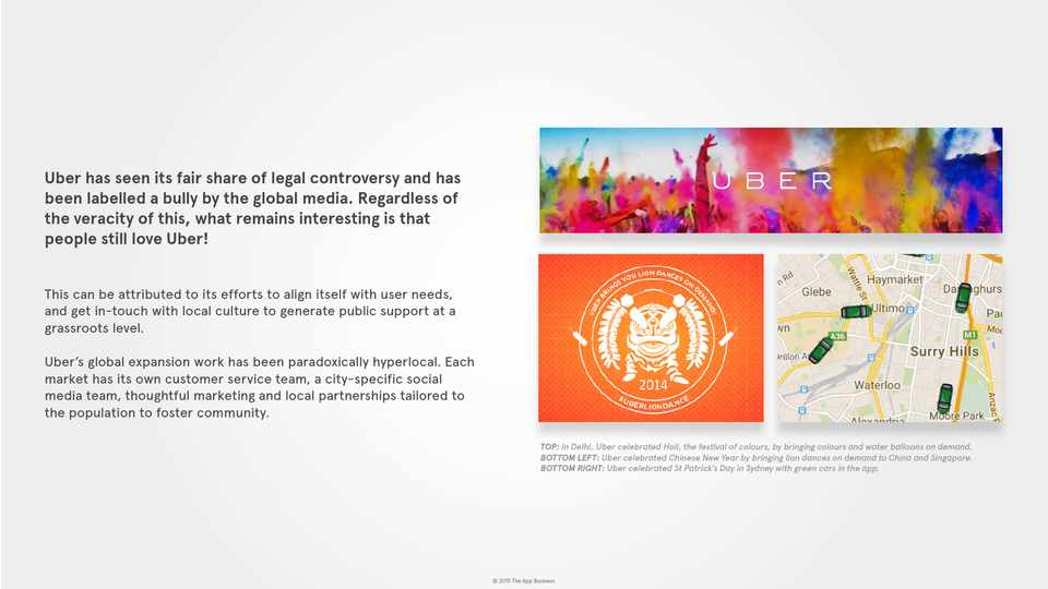TOP: In Delhi, Uber celebrated Holi, the festival of colours, by bringing colours and water balloons on demand. BOTTOM LEFT: Uber celebrated Chinese New Year by bringing lion dances on demand to China and Singapore. BOTTOM RIGHT: Uber celebrated St Patrick’s Day in Sydney with green cars in the app.