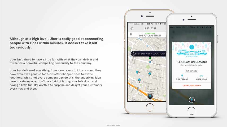 Uber isn’t afraid to have a little fun with what they can deliver and this lends a powerful, compelling personality to the company. Uber has delivered everything from ice-creams to kittens - and they have even even gone so far as to offer chopper rides to exotic locations. Whilst not every company can do this, the underlying idea here is a strong one: don’t be afraid of letting your hair down and having a little fun. It’s worth it to surprise and delight your customers every now and then.
