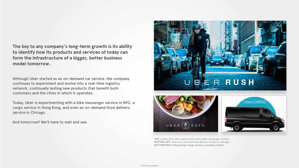 Today, Uber is experimenting with a bike messenger service in NYC, a cargo service in Hong Kong, and even an on-demand food delivery service in Chicago.