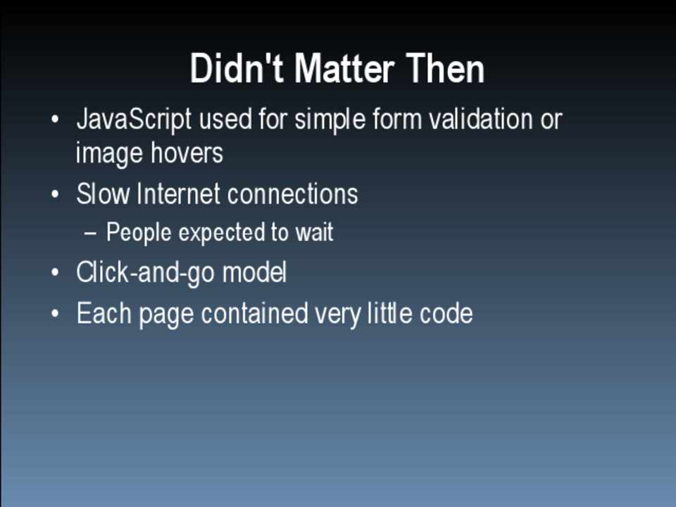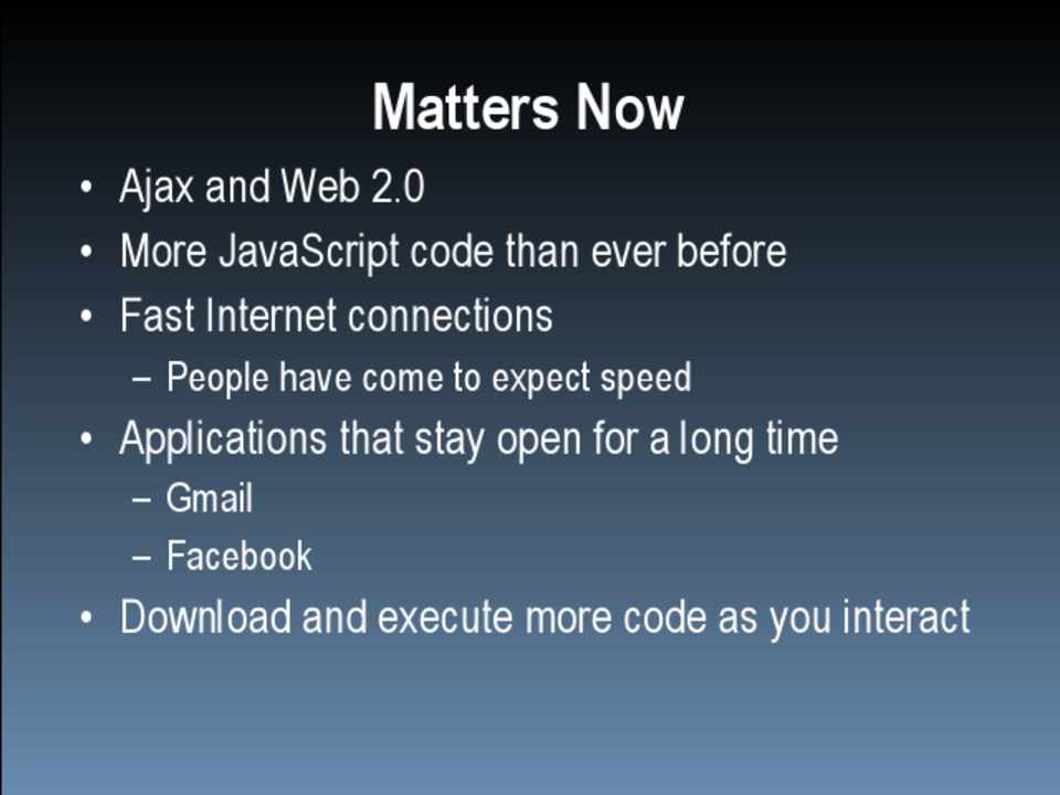 • Ajax and Web 2.0 • More JavaScript code than ever before • Fast Internet connections