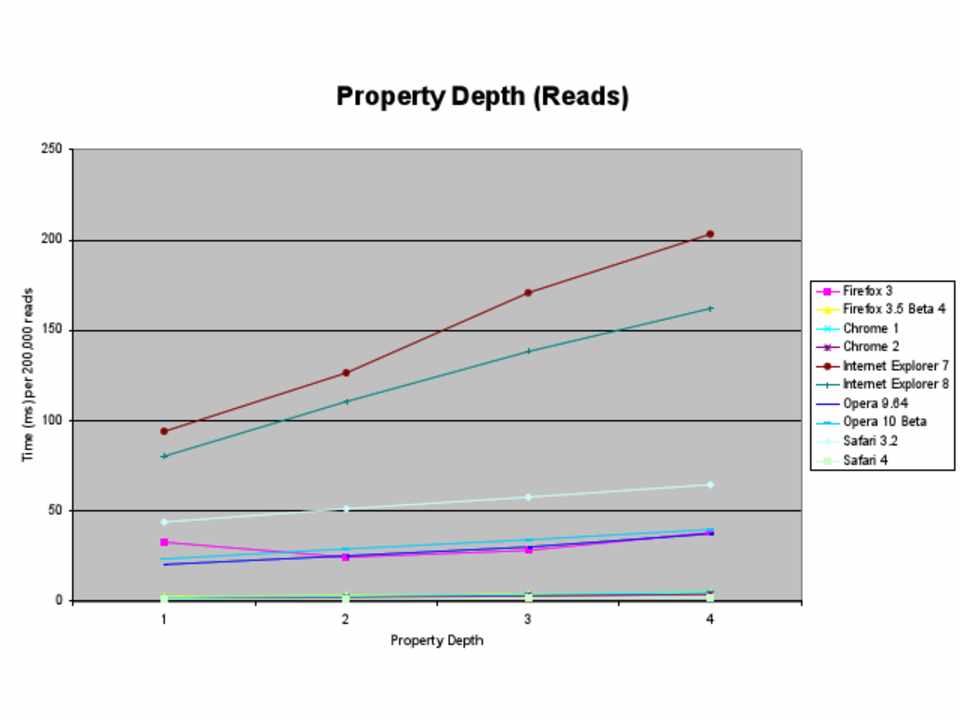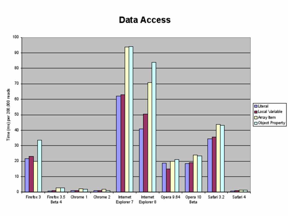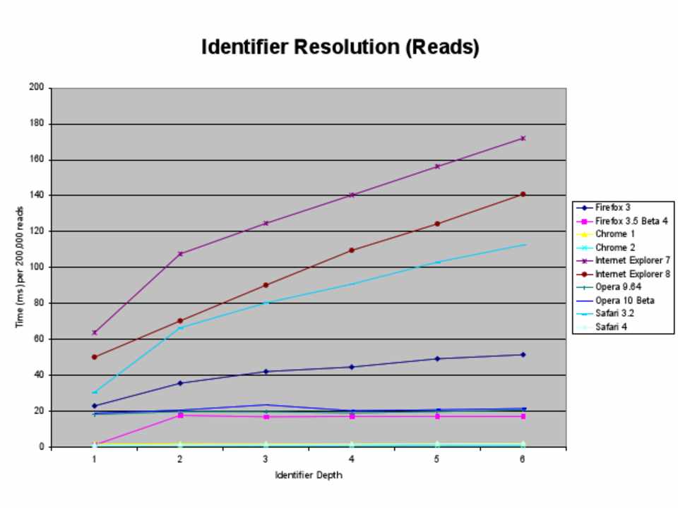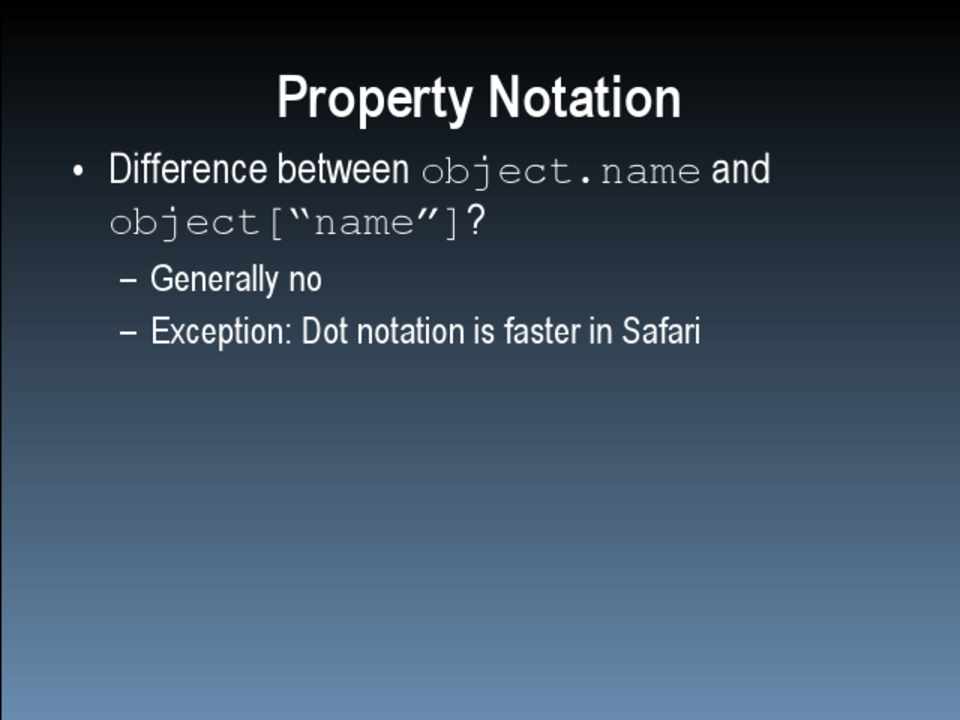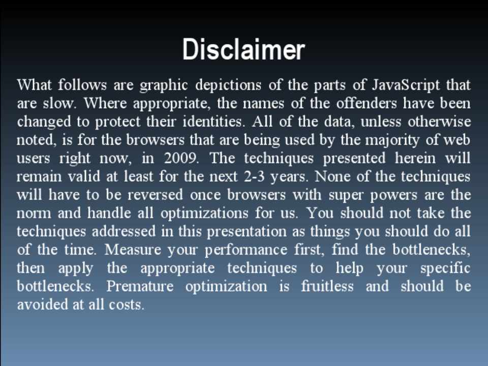 What follows are graphic depictions of the parts of JavaScript that are slow. Where appropriate, the names of the offenders have been changed to protect their identities. All of the data, unless otherwise noted, is for the browsers that are being used by the majority of web users right now, in 2009. The techniques presented herein will remain valid at least for the next 2-3 years. None of the techniques will have to be reversed once browsers with super powers are the norm and handle all optimizations for us. You should not take the techniques addressed in this presentation as things you should do all of the time. Measure your performance first, find the bottlenecks, then apply the appropriate techniques to help your specific bottlenecks. Premature optimization is fruitless and should be avoided at all costs.