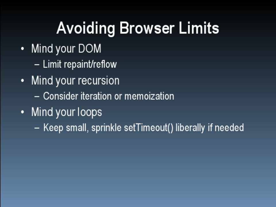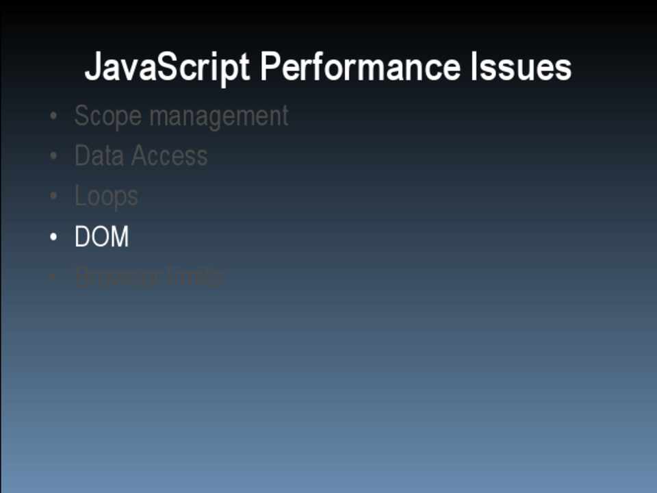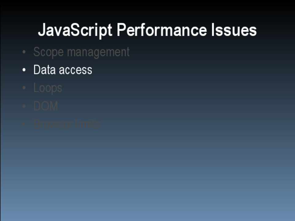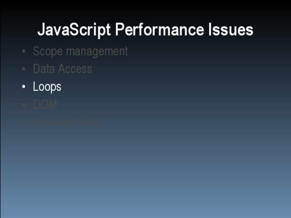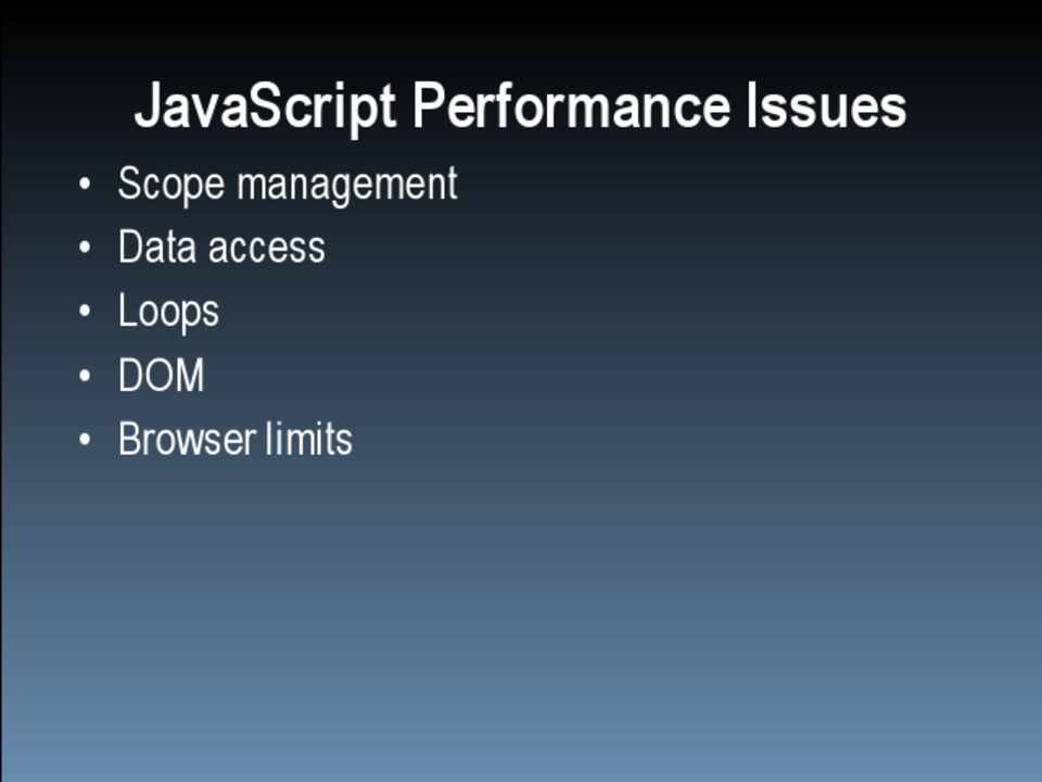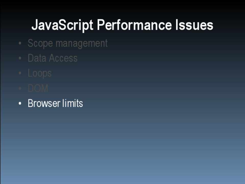 • Scope management • Data access • Loops • DOM • Browser limits