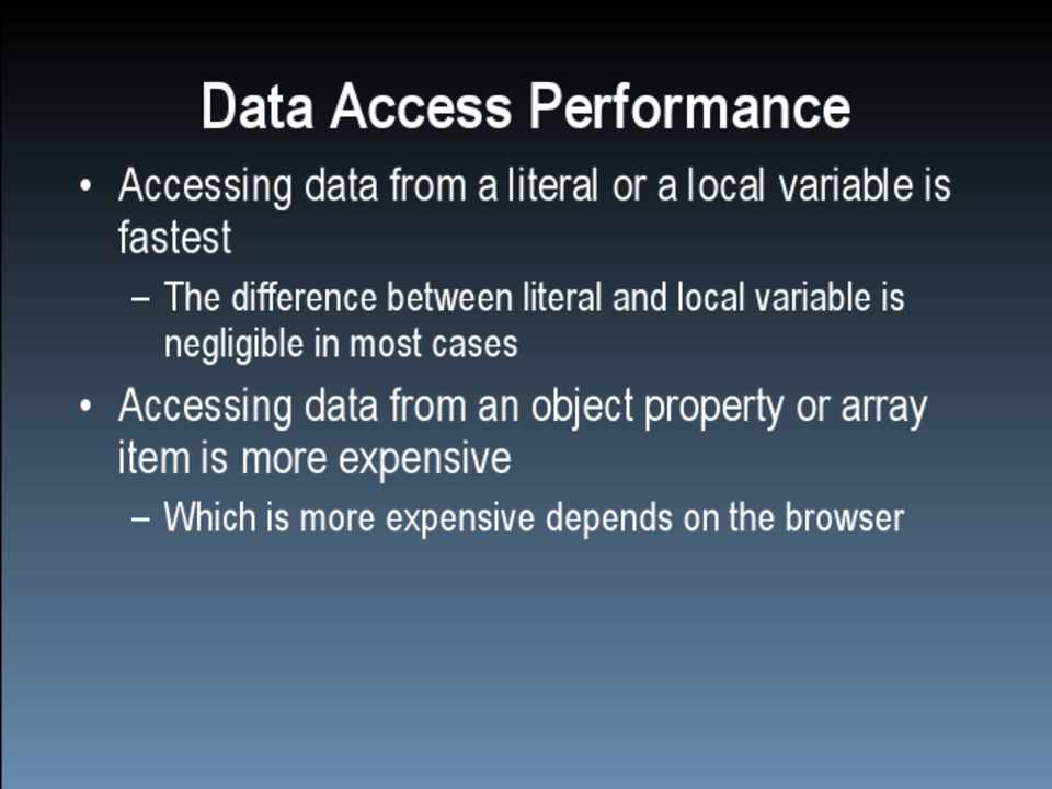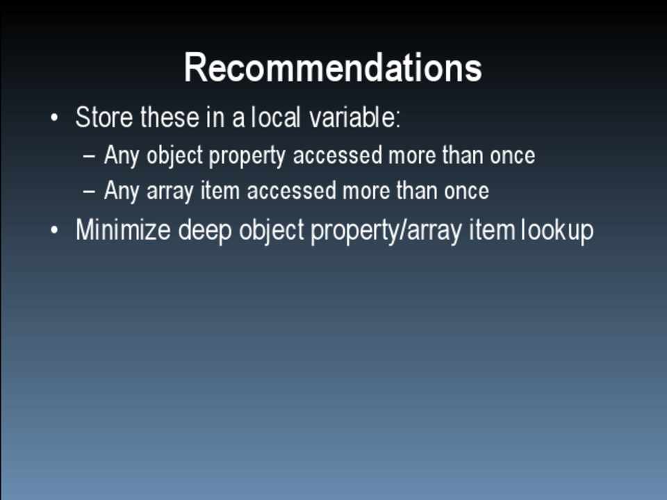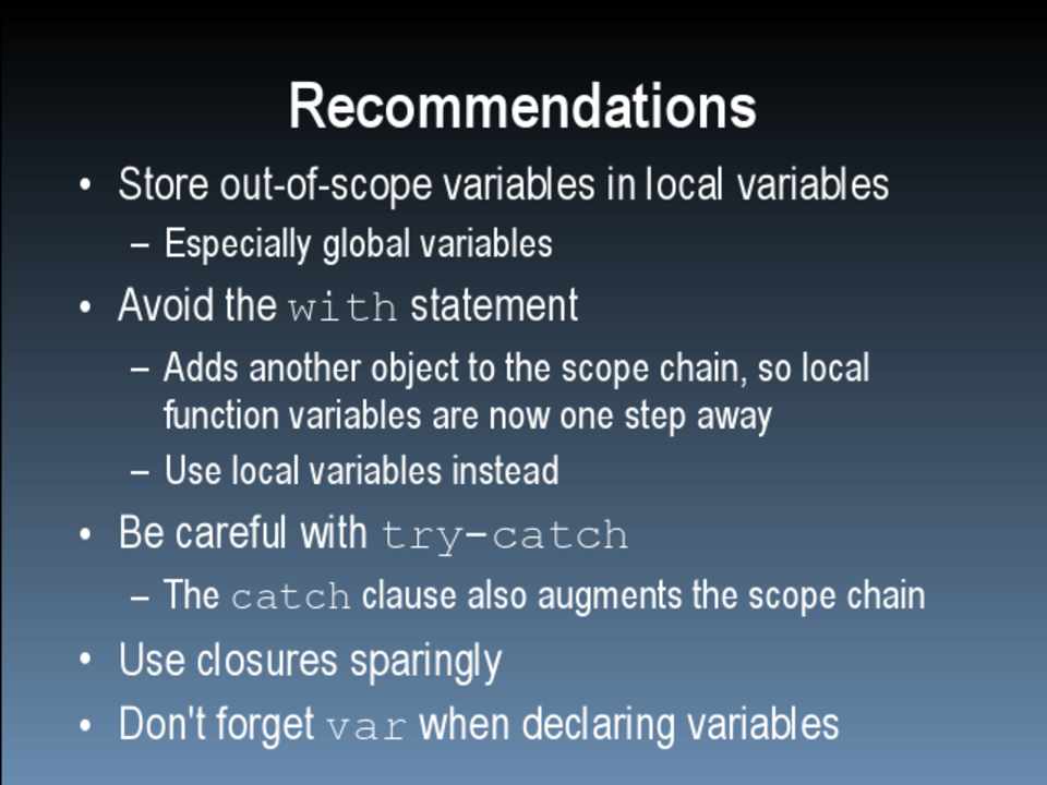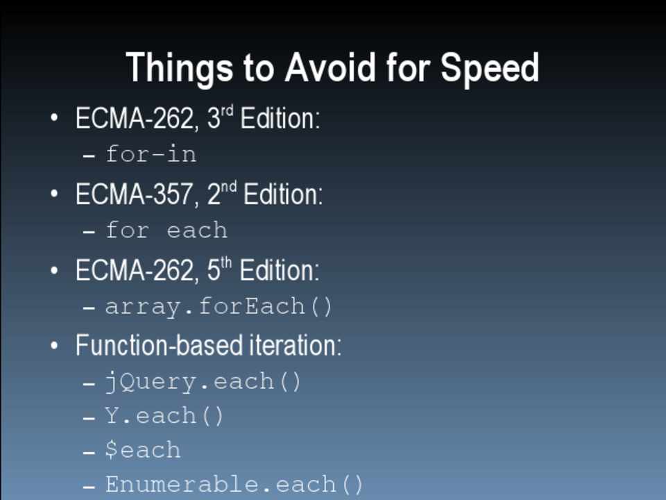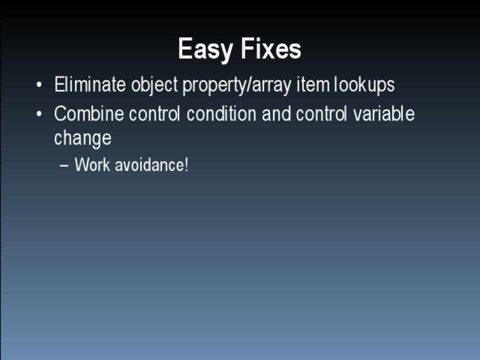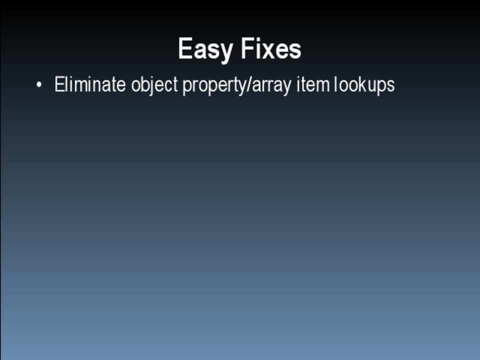 • Scope management • Data access • Loops • DOM • Browser limits