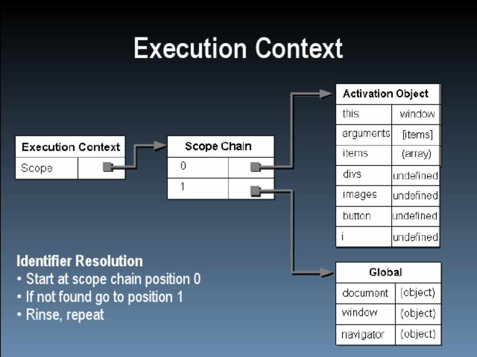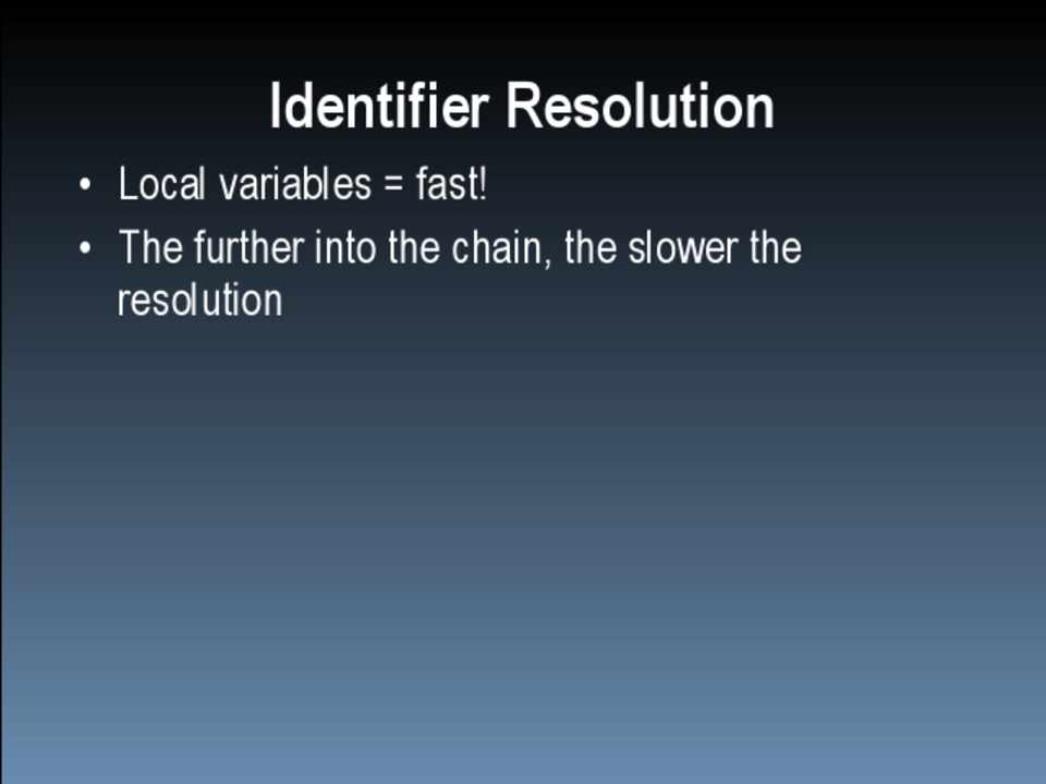 Identifier Resolution • Start at scope chain position 0 • If not found go to position 1 • Rinse, repeat