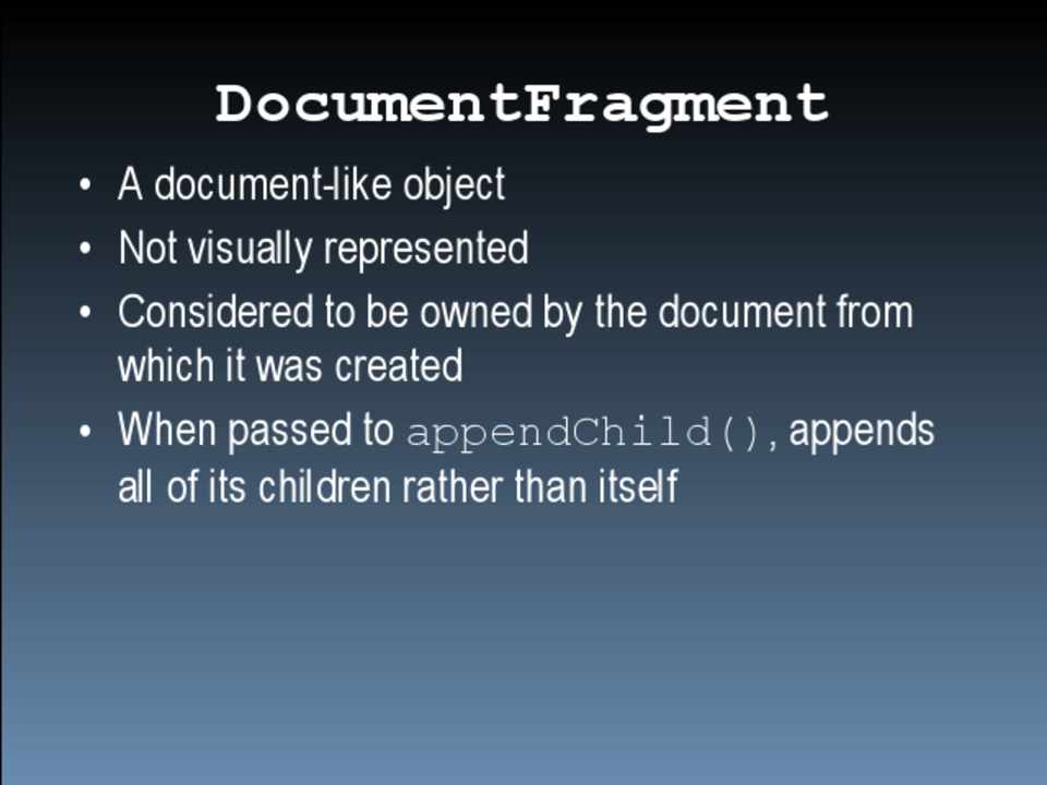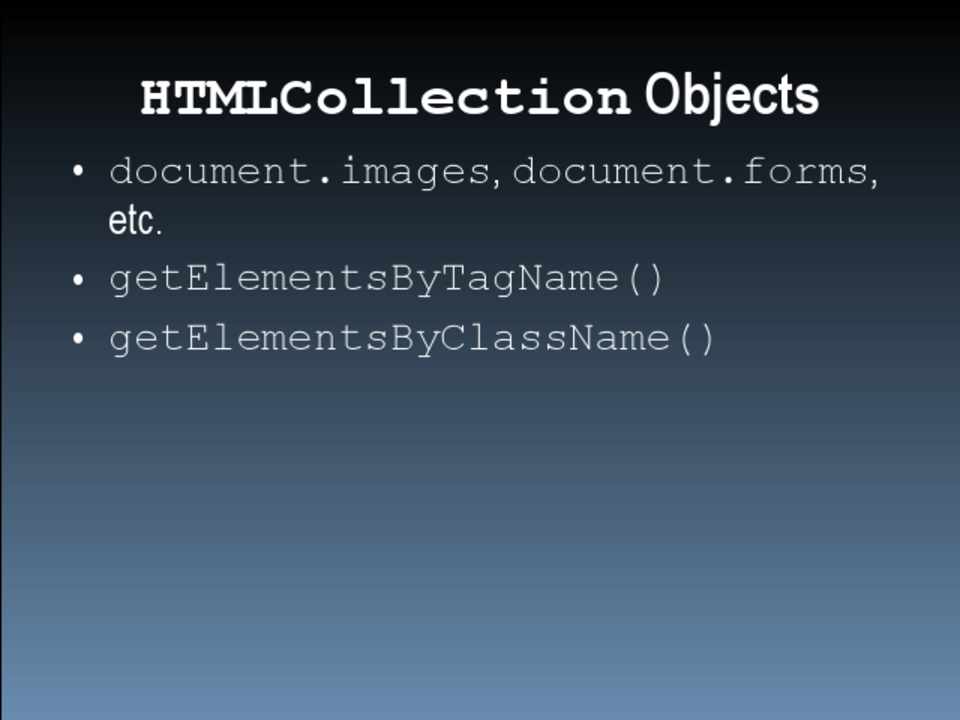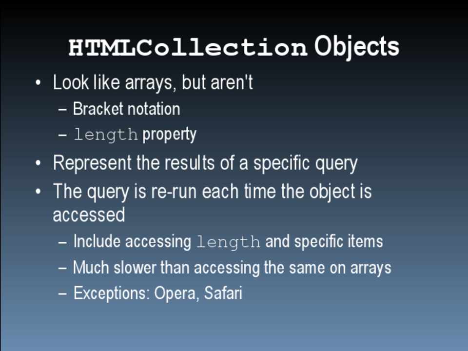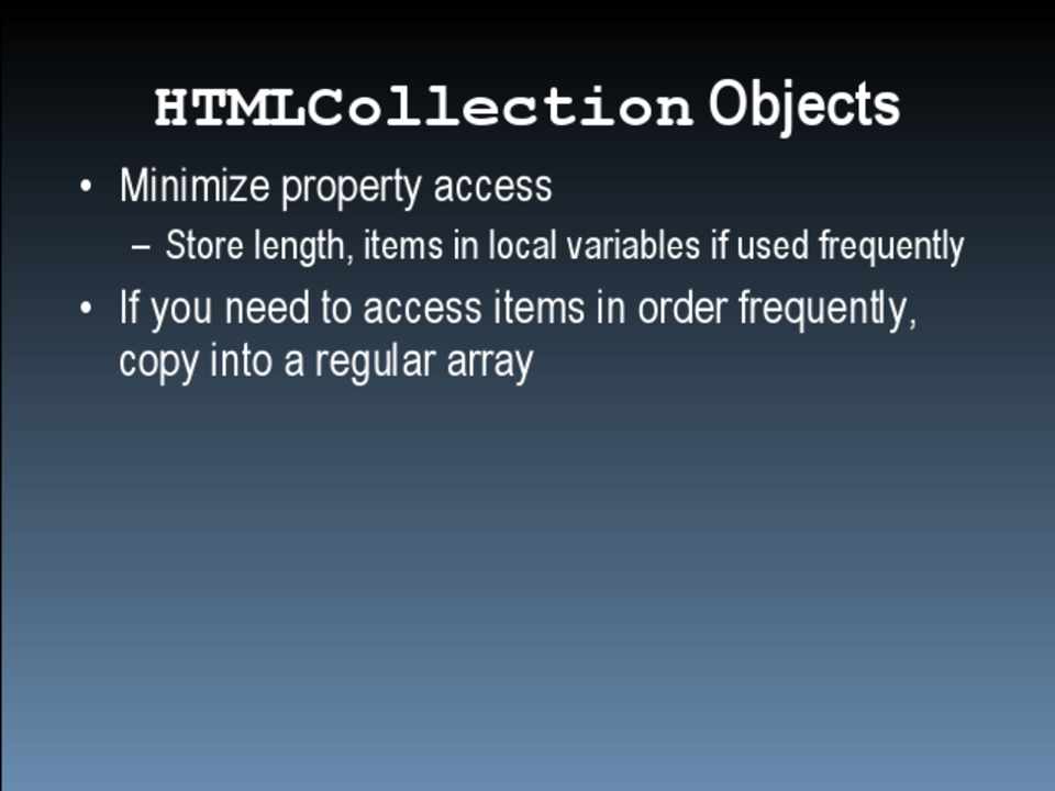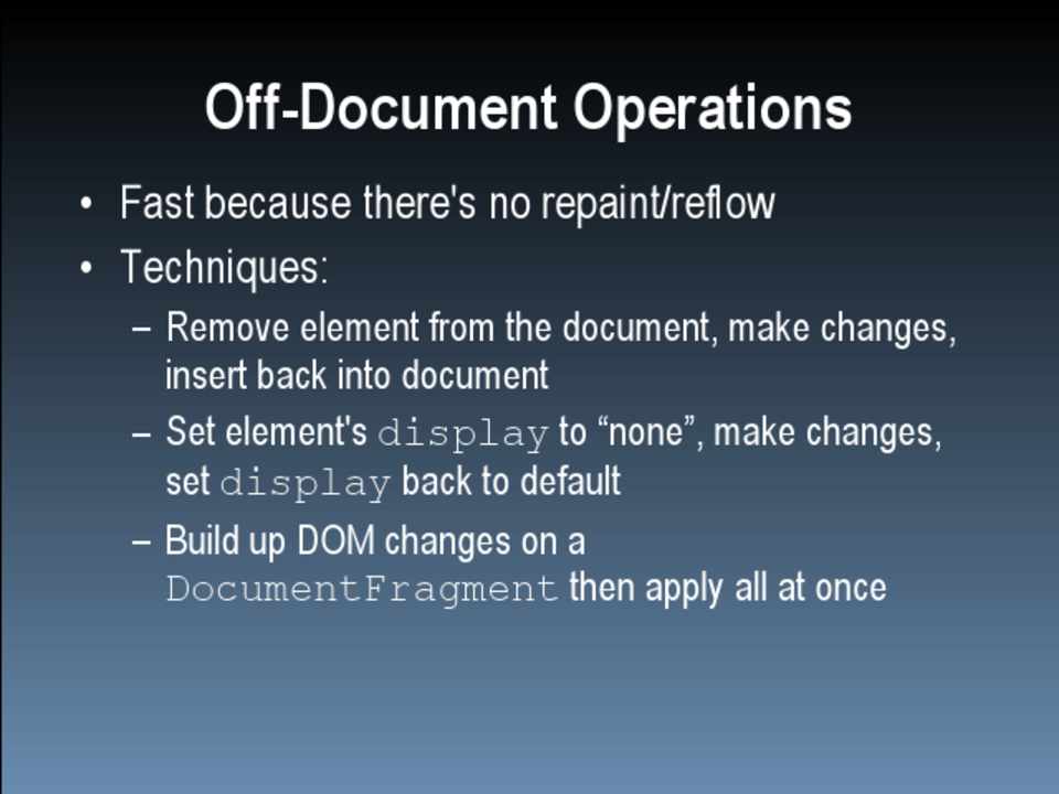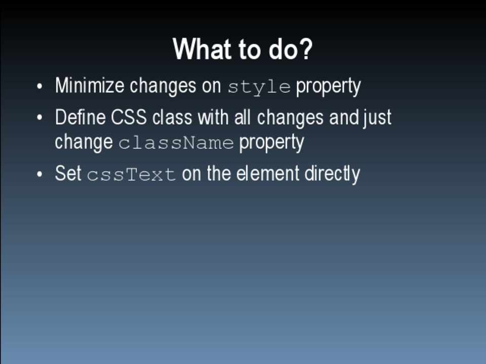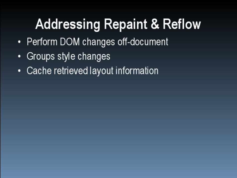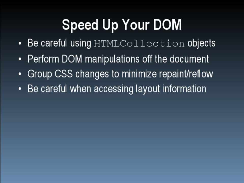 • Be careful using HTMLCollection objects • Perform DOM manipulations off the document • Group CSS changes to minimize repaint/reflow • Be careful when accessing layout information