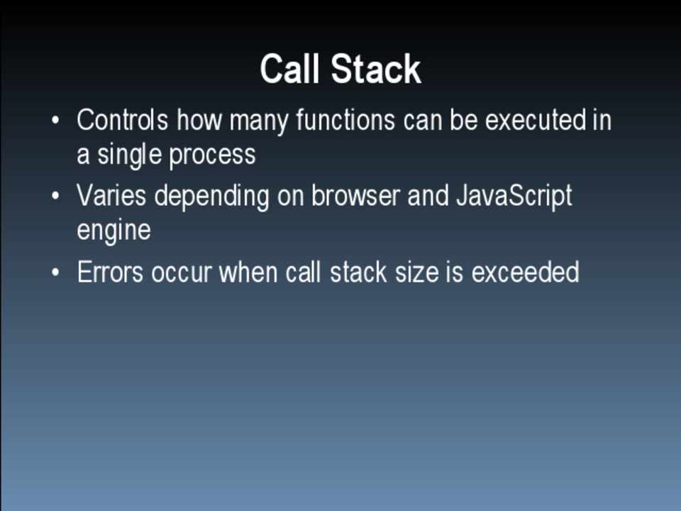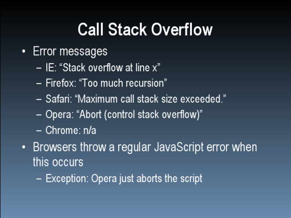 – IE: “Stack overflow at line x” – Firefox: “Too much recursion” – Safari: “Maximum call stack size exceeded.” – Opera: “Abort (control stack overflow)” – Chrome: n/a