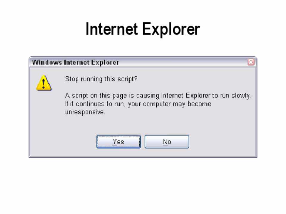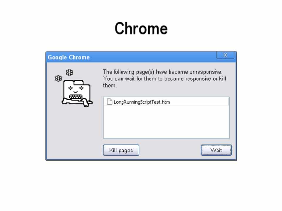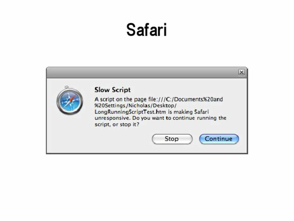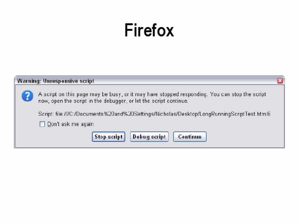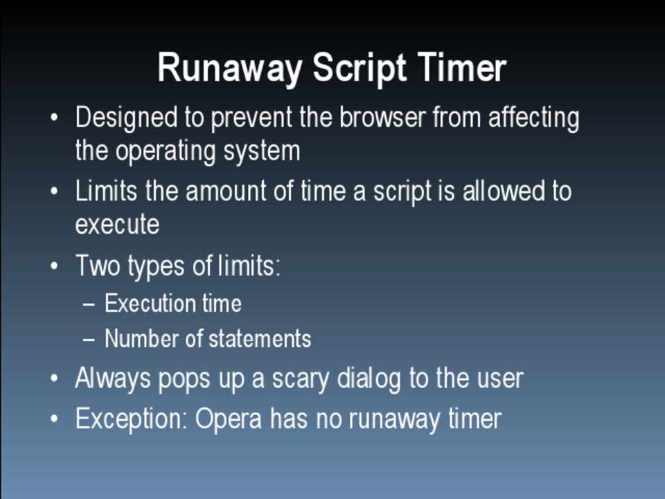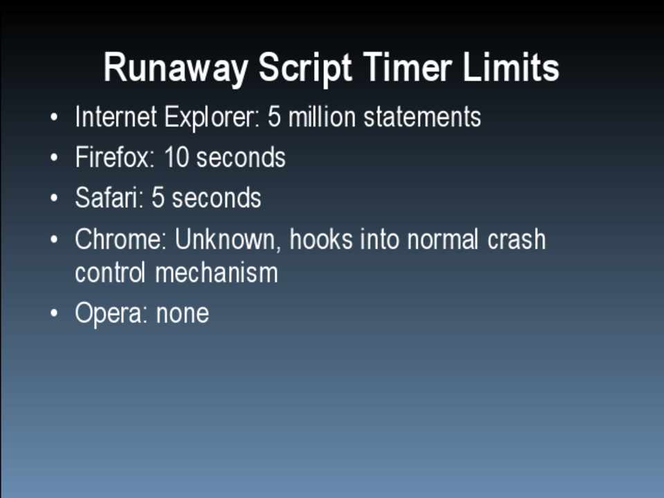 • Internet Explorer: 5 million statements • Firefox: 10 seconds • Safari: 5 seconds • Chrome: Unknown, hooks into normal crash
