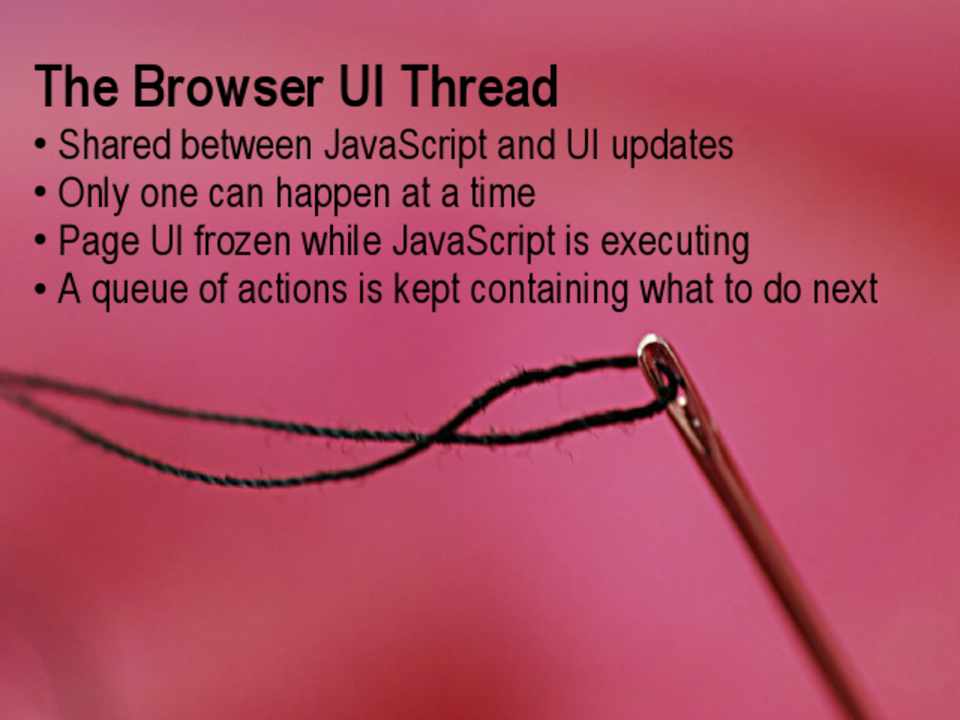 • Shared between JavaScript and UI updates • Only one can happen at a time • Page UI frozen while JavaScript is executing
