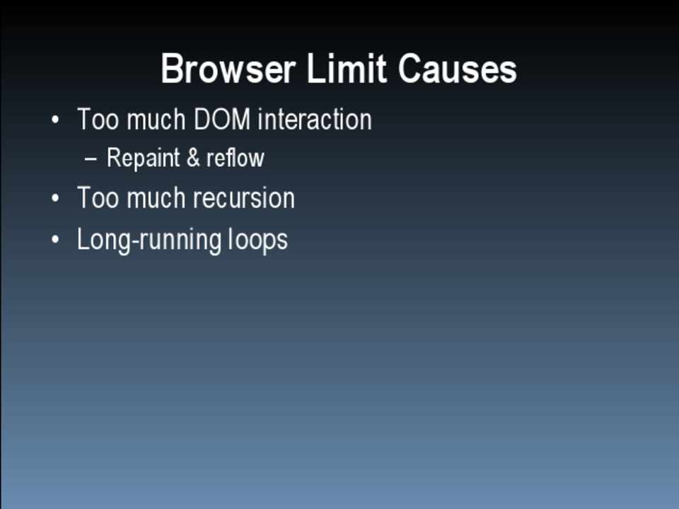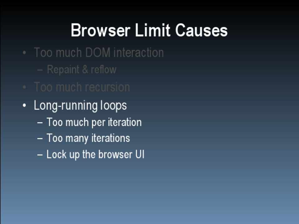 – Too much per iteration – Too many iterations – Lock up the browser UI