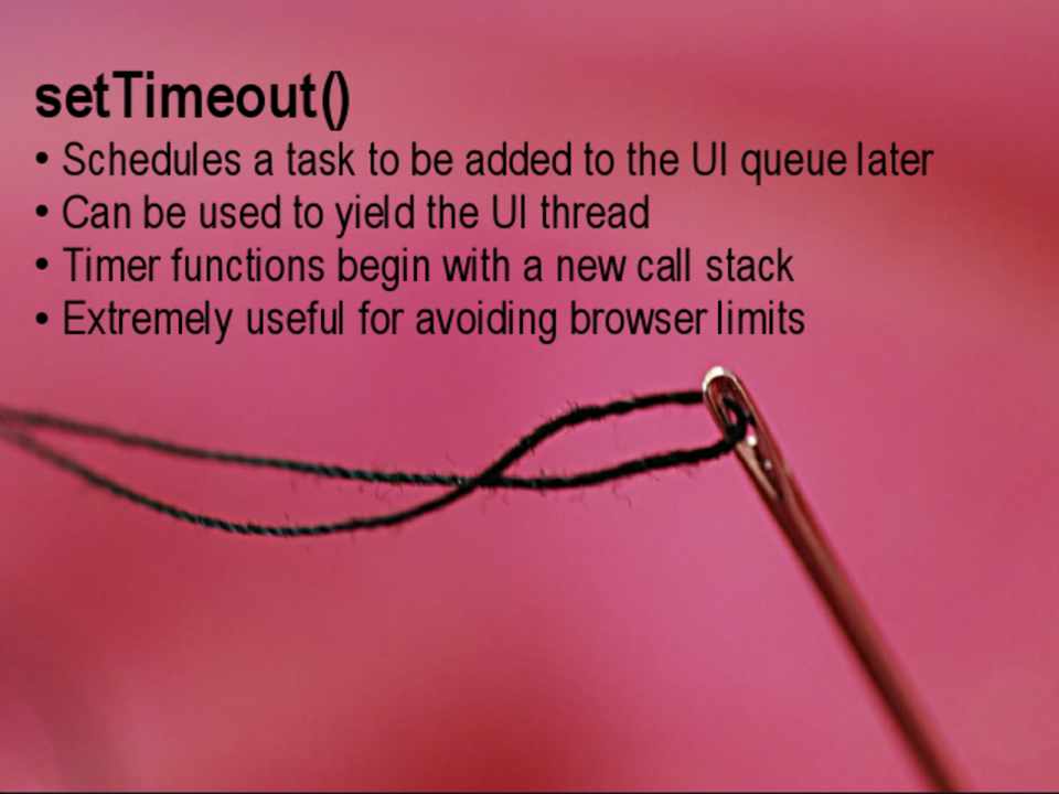 • Schedules a task to be added to the UI queue later • Can be used to yield the UI thread • Timer functions begin with a new call stack