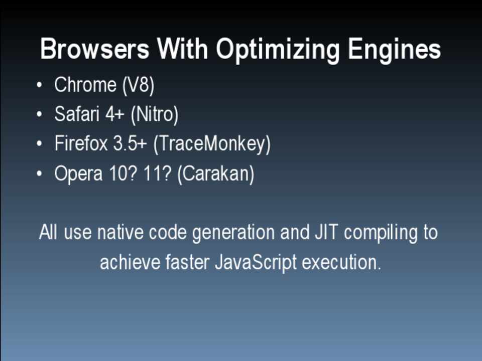 • Chrome (V8) • Safari 4+ (Nitro) • Firefox 3.5+ (TraceMonkey) • Opera 10? 11? (Carakan)