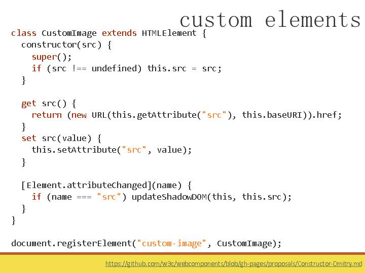 class CustomImage extends HTMLElement { constructor(src) { super(); if (src !== undefined) this.src = src; } get src() { return (new URL(this.getAttribute("src"), this.baseURI)).href; } set src(value) { this.setAttribute("src", value); } [Element.attributeChanged](name) { if (name === "src") updateShadowDOM(this, this.src); }}document.registerElement("custom-image", CustomImage);