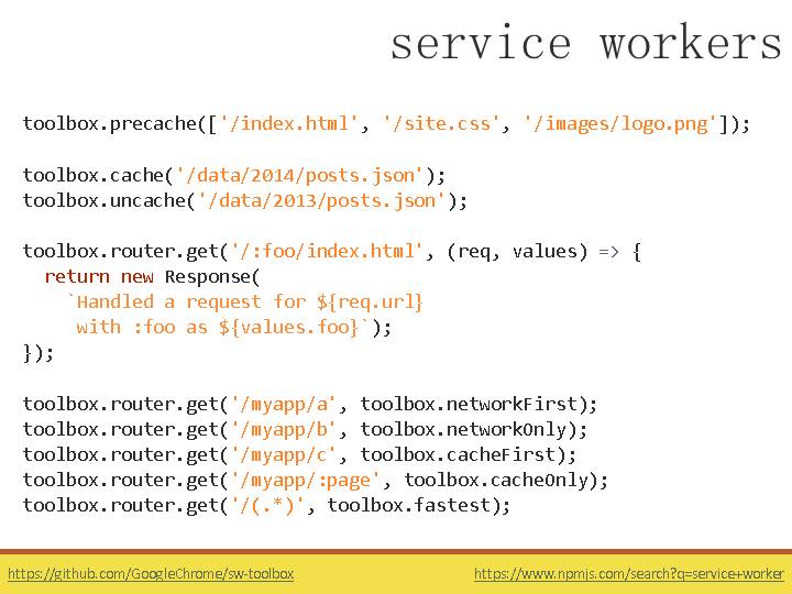 toolbox.precache(['/index.html', '/site.css', '/images/logo.png']);toolbox.cache('/data/2014/posts.json');toolbox.uncache('/data/2013/posts.json');toolbox.router.get('/:foo/index.html', (req, values) => { return new Response( `Handled a request for ${req.url} with :foo as ${values.foo}`);});toolbox.router.get('/myapp/a', toolbox.networkFirst);toolbox.router.get('/myapp/b', toolbox.networkOnly);toolbox.router.get('/myapp/c', toolbox.cacheFirst);toolbox.router.get('/myapp/:page', toolbox.cacheOnly);toolbox.router.get('/(.*)', toolbox.fastest);