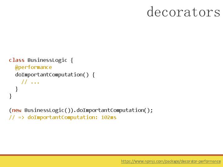 class BusinessLogic { @performance doImportantComputation() { // ... }}(new BusinessLogic()).doImportantComputation();// => doImportantComputation: 102ms