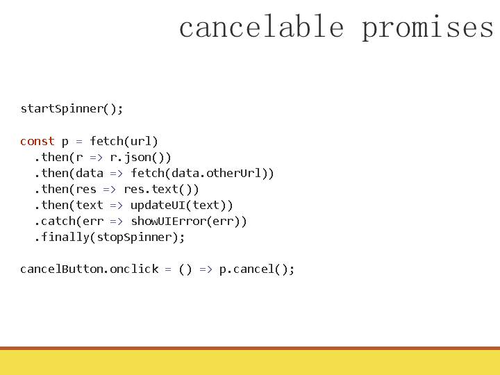 startSpinner();const p = fetch(url) .then(r => r.json()) .then(data => fetch(data.otherUrl)) .then(res => res.text()) .then(text => updateUI(text)) .catch(err => showUIError(err)) .finally(stopSpinner);cancelButton.onclick = () => p.cancel();