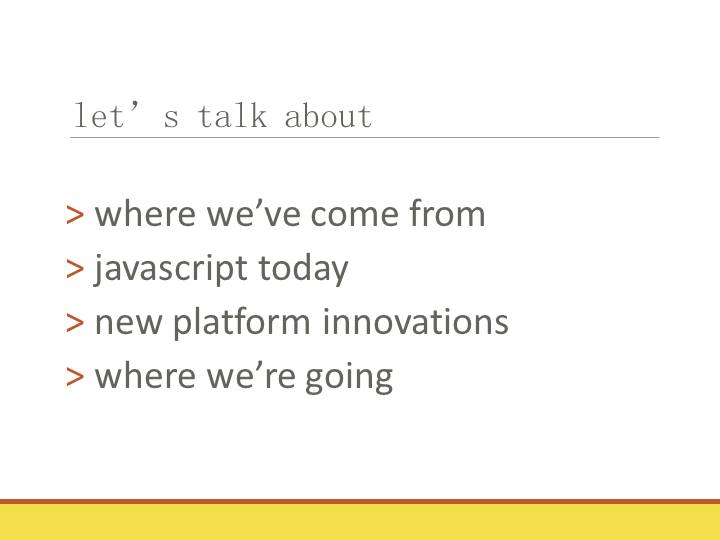 OK cool. So I hope you guys enjoyed hearing a bit about the cool ways that JavaScript is being used on the front-end, even at a Node.js conference. As I said, maybe Node.js can take some inspiration from the way the web is exposing more and more of itself to JavaScript, and refusing to slow down its API evolution. Anyway, let’s go back to talking about the language. What does the future hold for JavaScript?