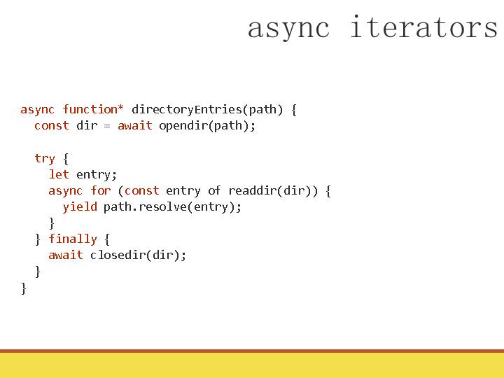 async function* directoryEntries(path) { const dir = await opendir(path); try { let entry; async for (const entry of readdir(dir)) { yield path.resolve(entry); } } finally { await closedir(dir); }}