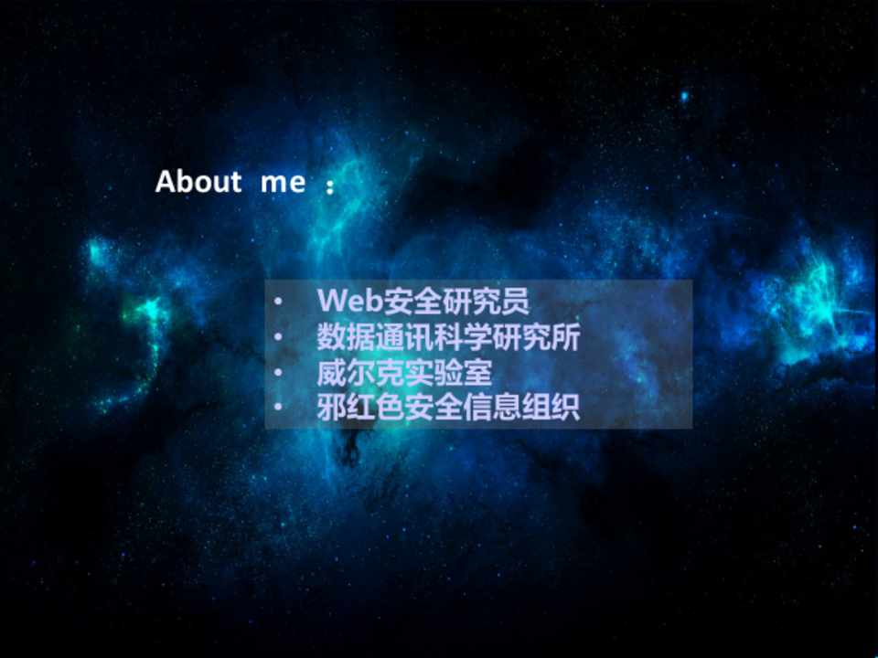 • Web安全研究员 • 数据通讯科学研究所 • 威尔克实验室 • 邪红色安全信息组织
