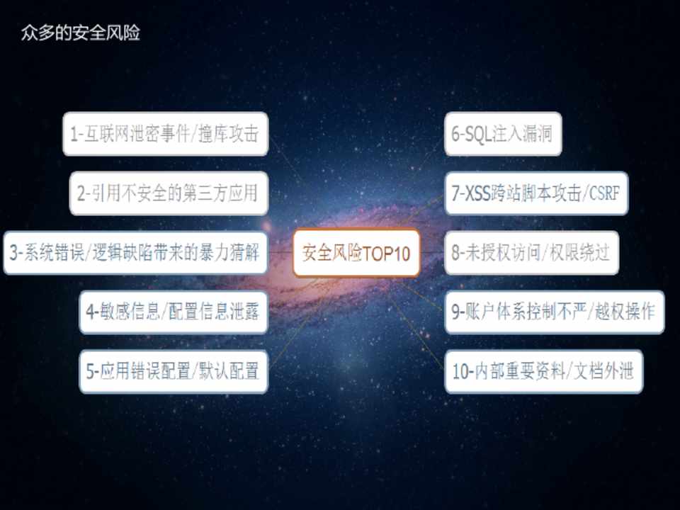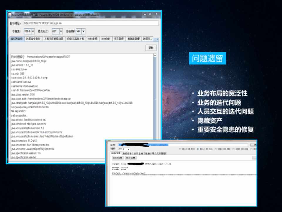 • 业务布局的宽泛性 • 业务的迭代问题 • 人员交互的迭代问题 • 隐藏资产 • 重要安全隐患的修复