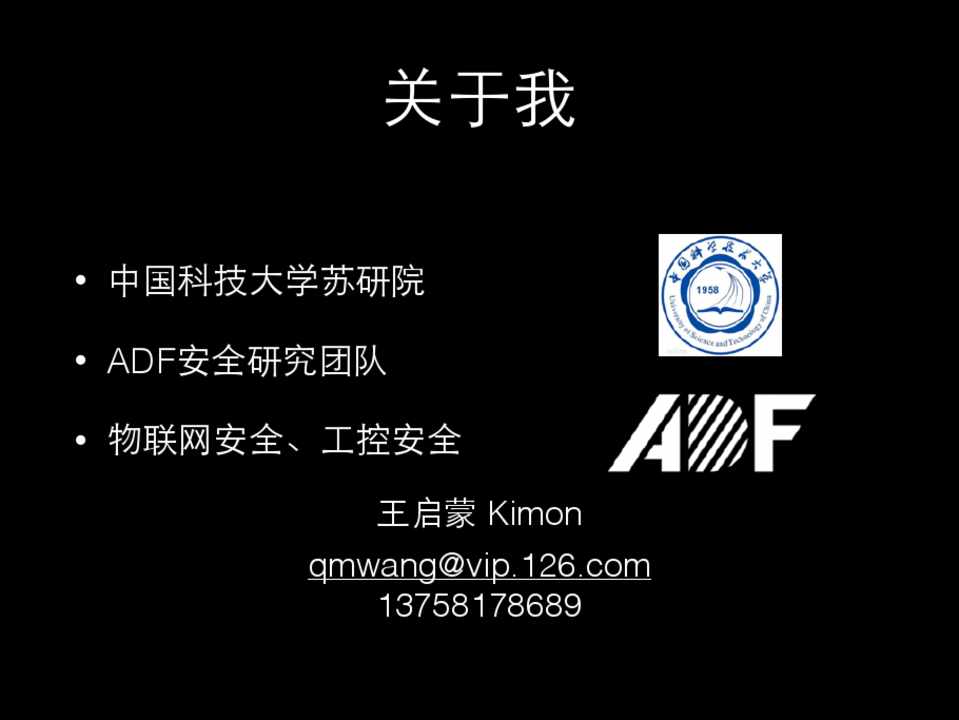 • 中国科技⼤大学苏研院 • ADF安全研究团队 • 物联⺴⽹网安全、⼯工控安全