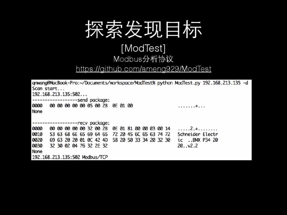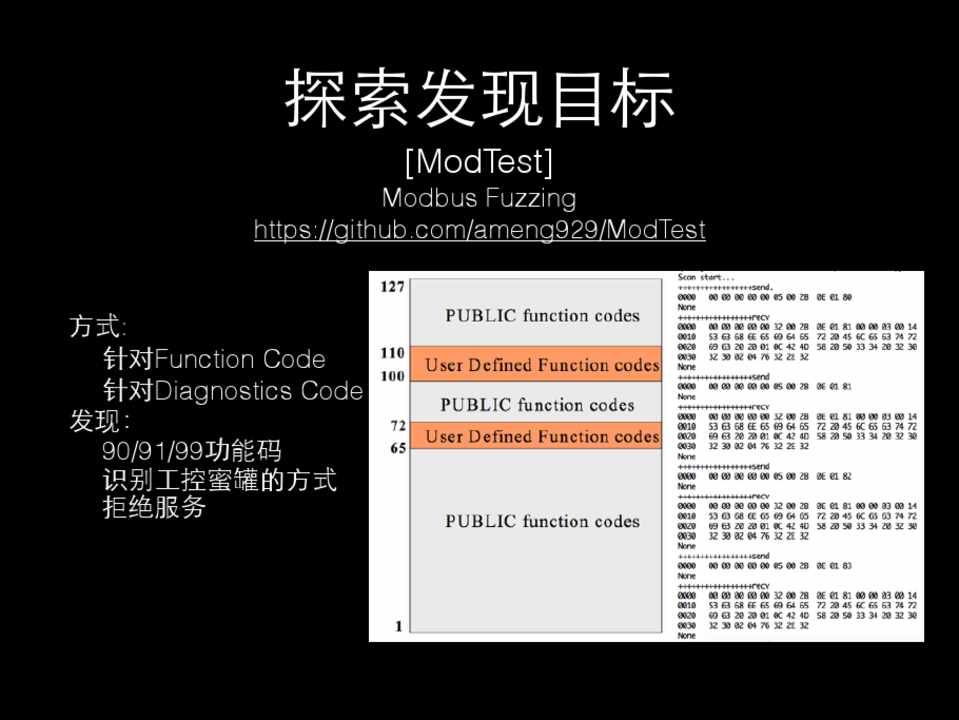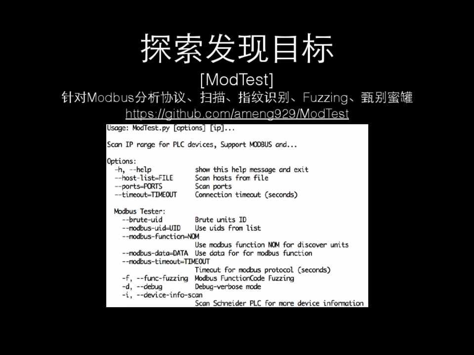 针对Modbus分析协议、扫描、指纹识别、Fuzzing、甄别蜜罐 https://github.com/ameng929/ModTest