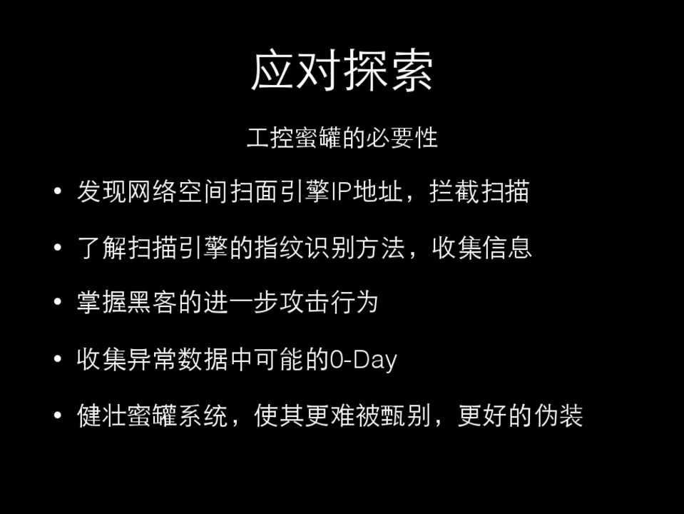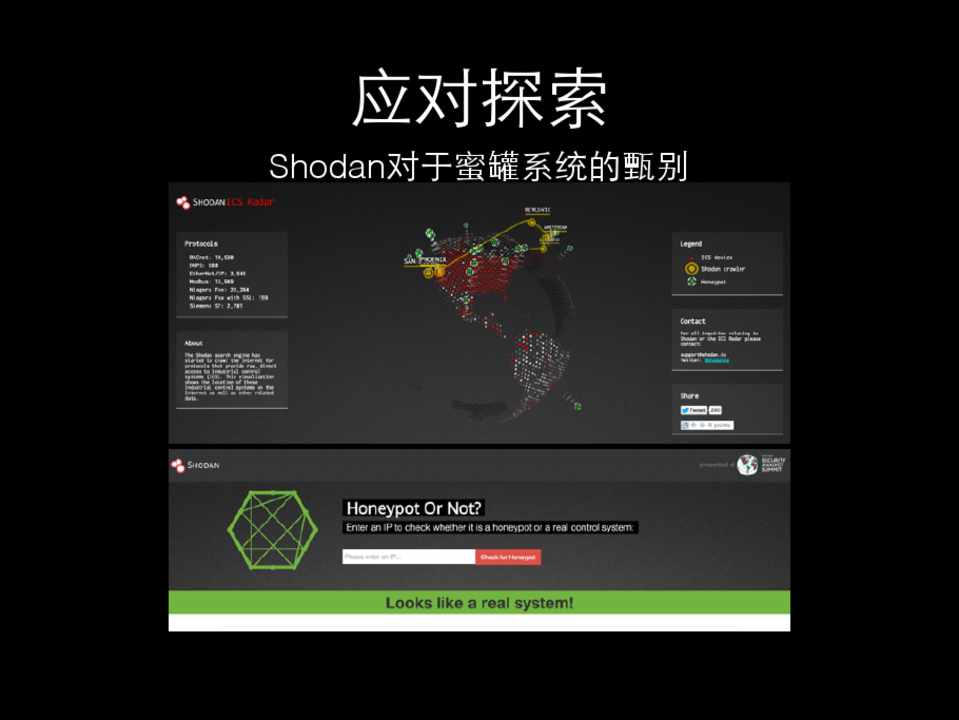• 发现⺴⽹网络空间扫⾯面引擎IP地址,拦截扫描 • 了解扫描引擎的指纹识别⽅方法,收集信息 • 掌握⿊黑客的进⼀一步攻击⾏行为 • 收集异常数据中可能的0-Day • 健壮蜜罐系统,使其更难被甄别,更好的伪装